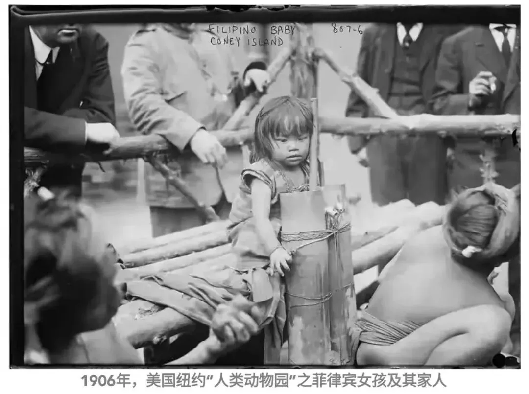 不要觉得美国的纽约人类动物园里关押的都是黑人,黄种人在当时一样被视为“土著”和“野蛮人”,在纽约人类动物园里被关押的一个菲律宾女孩及其家人,就被衣冠楚楚的纽约白人们当猴子一样观赏,这一切都被相机给记录了下来。这种人类动物园的发明并不是英国和美国的专属,而是在整个欧美世界流行。1899年,“巴黎热带花园”开张,主办方从法国殖民帝国的各个殖民地“购买”了很多土著居民,然后1:1地仿制原生态的房屋。一共在花园里建起了6个村落,持续展览了几个月时间,吸引了100万游客入场参观。1906年,法国马赛举行殖民地展览,半裸或全裸的“殖民地人种”被关在笼子里展示。1907年,法国巴黎举行殖民地展览,半裸或全裸的“殖民地人种”被关在笼子里展示。1931年,柏林动物园展出从非洲带回的大象,以及一群非洲黑人。以上这些,只是我随手查到的有据可考人类展出记录,远远不是全部。为满足游客的猎奇心理,获取经济利益,还曾经出现过动物园们故意“制造”各种畸形和奇特的“土著”供游客参观。比如一个叫板加的非洲男孩就曾经被人硬生生的把满嘴的牙齿全部磨成尖尖的样子,然后被当成了稀有品展出。被展出的黄种土著人也不止菲律宾人,我们中国人也有份,无据可考的不知道有多少,但仅有据可考的就有两个例子。1840年《南京条约》签订之后,中国的大门被殖民者轰开,欧美国家开始了掠夺中国的狂潮。1842年,来自美国的卡恩兄弟从中国拐骗了一个19岁的会弹琵琶的中国姑娘前往美国纽约,将她带到美国后取名莫阿芬,然后把她关押进了动物园。在这个动物园里,这个被关在铁笼子里的中国姑娘阿芬需要按照游客的要求提起裤管展示自己的小脚,每名进场观看的游客需要缴纳50美分,看小脚走路需要再加收50美分,所有收入全部归卡恩兄弟。我们之所以能知道这位中国姑娘的故事,是因为当时刊登在美国报纸上的一则宣传海报,否则这件事就只能像其他茫茫多的例子一样湮灭在历史长河中无人得知。还有个案例就是1910年,日本殖民者将台湾原住民带到英国伦敦,以日本“殖民地土著”的身份参加了英国组织的人种博览会,和其他欧洲列强的“殖民地土著”一起展出,也留下了照片记录。1910年啊,大清都马上要亡了,台湾土著都能被当成稀有动物来展出。世界上最后一次的人类动物园,也就是所谓的人种博览会,是在1958年举办的,地点是比利时布鲁塞尔,名称叫万国博览会。在这个最后的人类动物园中,183个刚果家庭的273名男子、128名妇女和197名儿童在3公顷的模拟热带村庄中,被展出长达数月。一名记者写道:“如果围栏里没有反应,游览者会把钱或香蕉投到围栏里。”