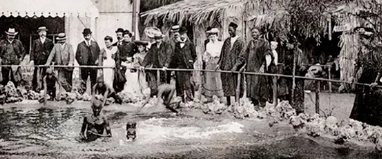 随后居维叶把萨拉的全身都制成了模型标本,放在了巴黎的人类博物馆里进行陈列。但萨拉的悲剧只是人类动物园的沧海一粟,甚至购买和依靠萨拉赚钱的主人只是几个小商人,都没有形成规模。1889年,巴黎世界博览会里专门为非洲黑人建造了一个“刚果村”,名曰展示土著的原生态生活,来参观的欧洲游客把他们当成动物一般观赏戏弄。1904年,美国圣路易斯建造了大规模的“人类动物园”。1906年,美国纽约建造了大规模的“人类动物园”。美国的这些人类动物园把全球各种土著抓到园子里关押,然后修建其“原生态建筑”供游客参观,土著们被迫在极其糟糕的卫生条件下艰难求存。因为美国当时的富裕,纽约的人类动物园得以留下了很多照片,让我们可以还原当时的情形。根据流传下来的资料,一个叫奥塔•本加的刚果人被美国商人弗纳以5美元的价格买下,送到了纽约动物园被关在了灵长类动物的笼子里,旁边的介绍里写着:“名字:Ota Benga;身高:4英尺11英寸;体重:103磅;年龄:23岁;擅长射箭,由塞缪尔•弗纳博士从非洲中南部刚果自由邦开赛河流域购入,每天下午展览。”