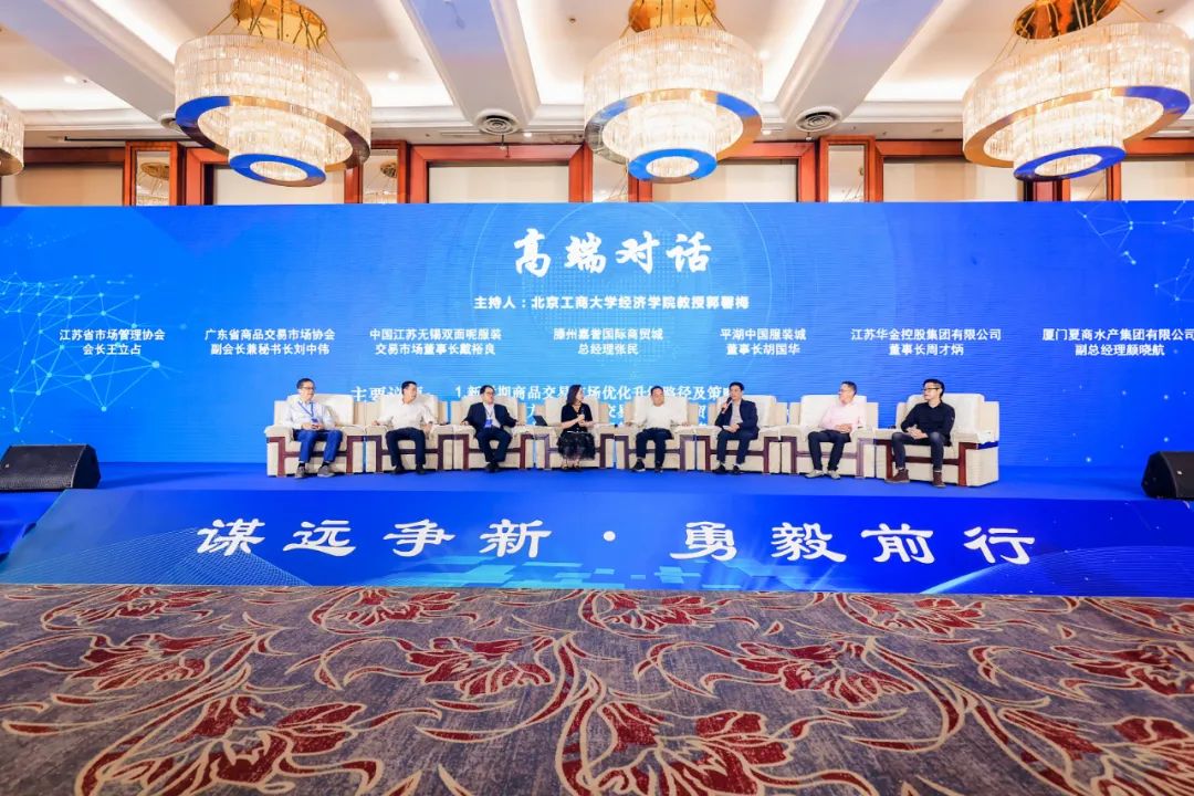 本届大会高端对话环节由北京工商大学教授、博士生导师郭馨梅主持。中国市场学会副会长、滕州嘉誉国际商贸城总经理张民,江苏省市场管理协会会长王立占,广东省商品交易市场协会副会长兼秘书长刘中伟,中国江苏无锡双面呢服装交易市场董事长戴裕良,平湖中国服装城董事长胡国华,江苏华金控股集团有限公司董事长周才炳,厦门夏商水产集团有限公司副总经理颜晓航等嘉宾,分别围绕“新时期商品交易市场优化升级路径及策略”“新型贸易方式下商品交易市场内外贸融合发展特点与政策建议”“未来商品交易市场发展创新转型的跨界合作及机制创建”等议题坦诚建言、倾力献策。
