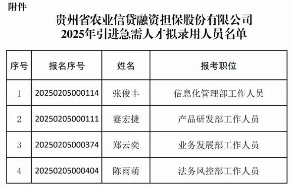 贵州省农业信贷融资担保股份有限公司2025年引进急需人才拟录用人员公示