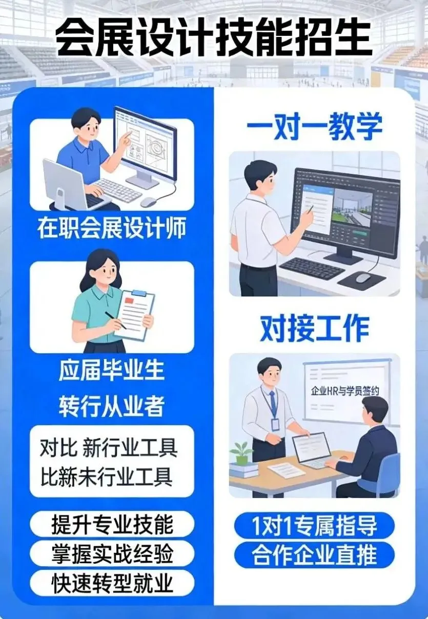 别再迷茫了!会展设计是个非常看重实操能力的行业。来咱们学校,从软件基础(3DMAX、CAD、SU、PS)到方案构思,从展台搭建到物料落地,全流程手把手教你。让你毕业即就业,带着作品集直接去面试,底气十足!