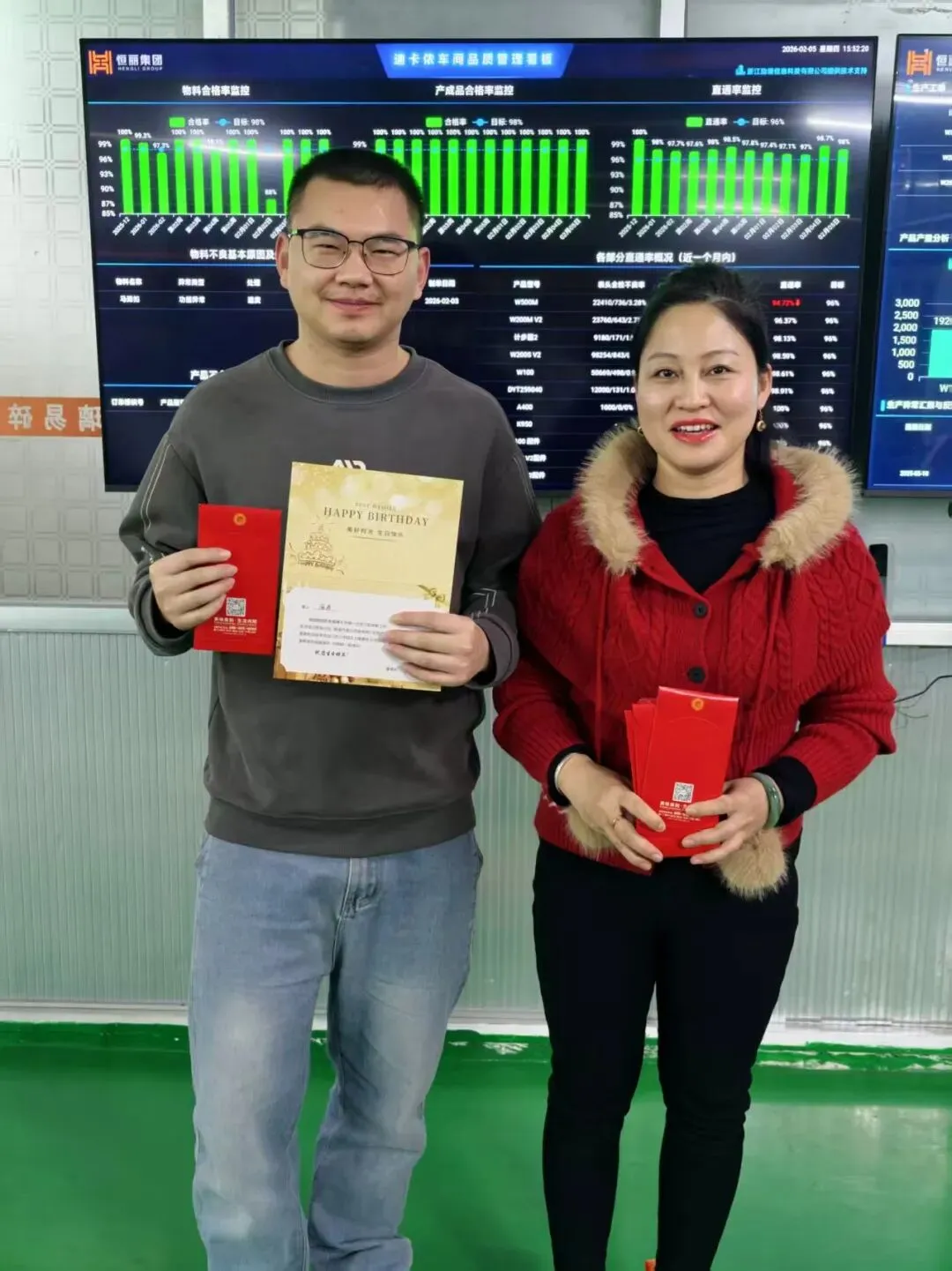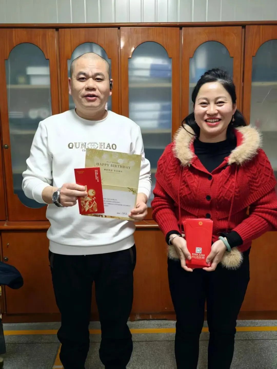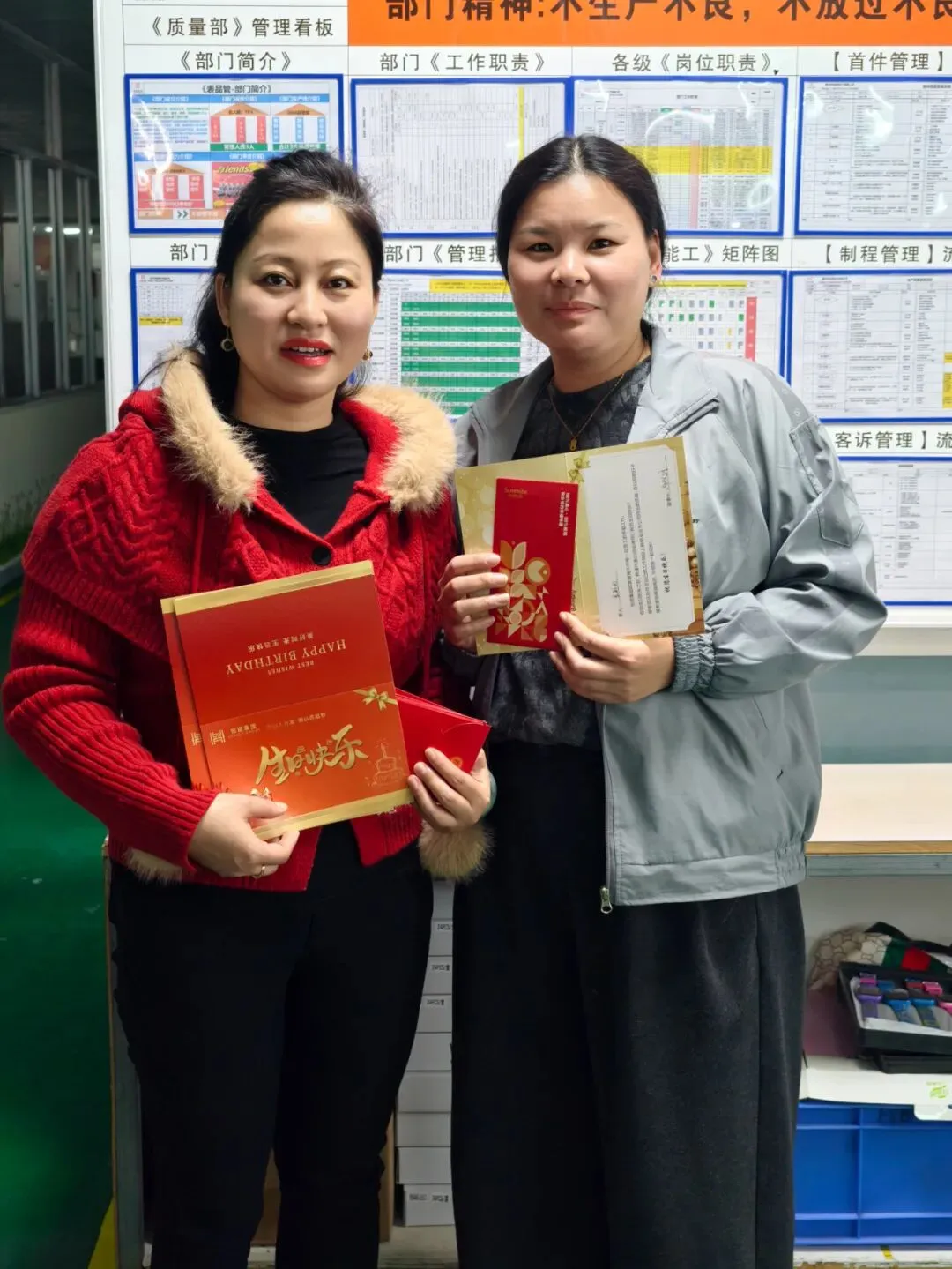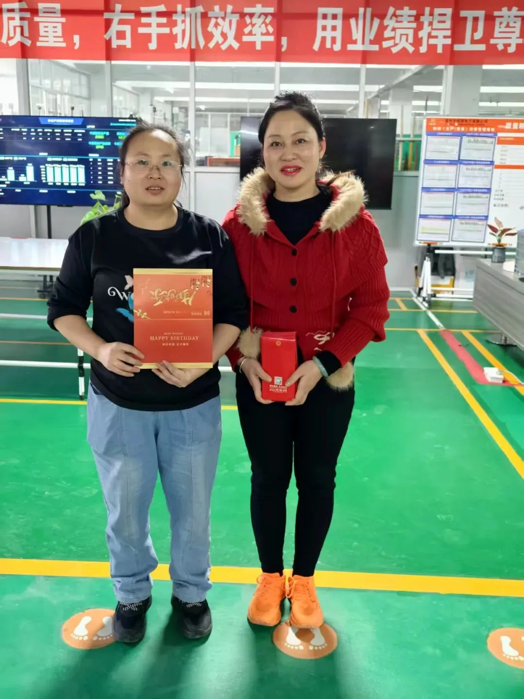 在机器运转的间隙,在质量管理看板前,在繁忙的生产车间里,二月的生日祝福如期而至。一张张灿烂的笑脸,被金色的“HAPPY BIRTHDAY”贺卡和暖心的红包点亮。我们见证的,不仅是岁岁年年的成长,更是每一天并肩奋斗的情谊。