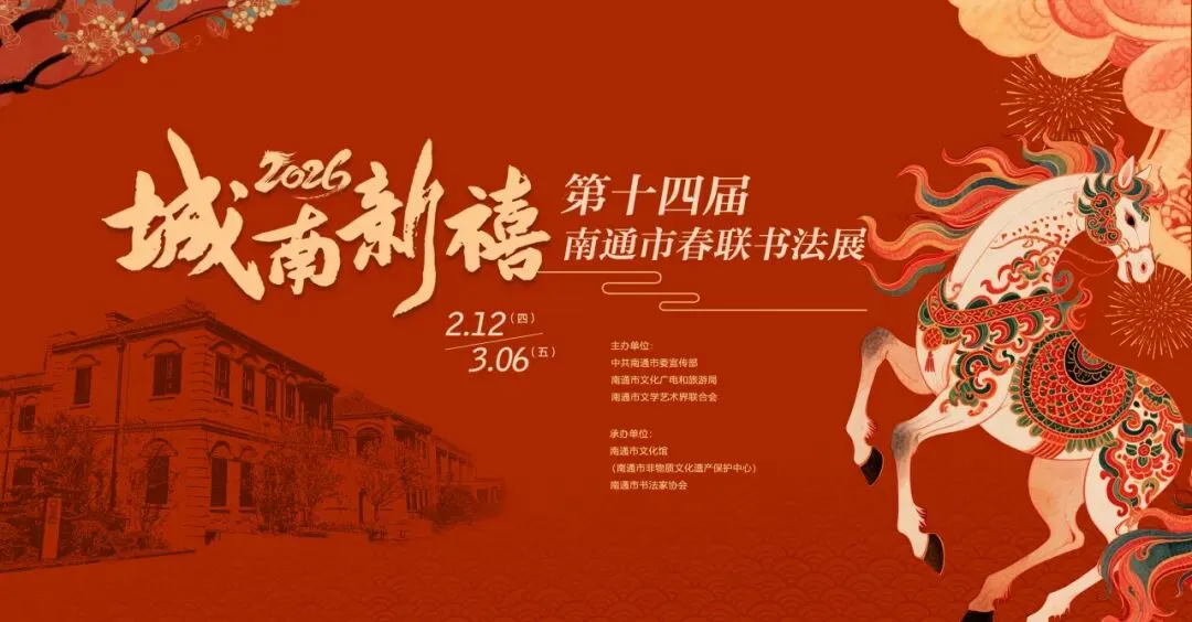 骐骥奔腾开新局,墨香涌动暖江海。当新春的脚步临近,当城南的风里飘起年味,一场承载着千年祈福传统与南通近代精神的文化盛宴正在等待您的到来:2026“城南新禧”南通市春联书法展于2月12日至3月6日在南通群英馆举办,以红联映春,以墨韵传情,邀您共赴一场“有年味、有文脉、有温度”的书法之约。