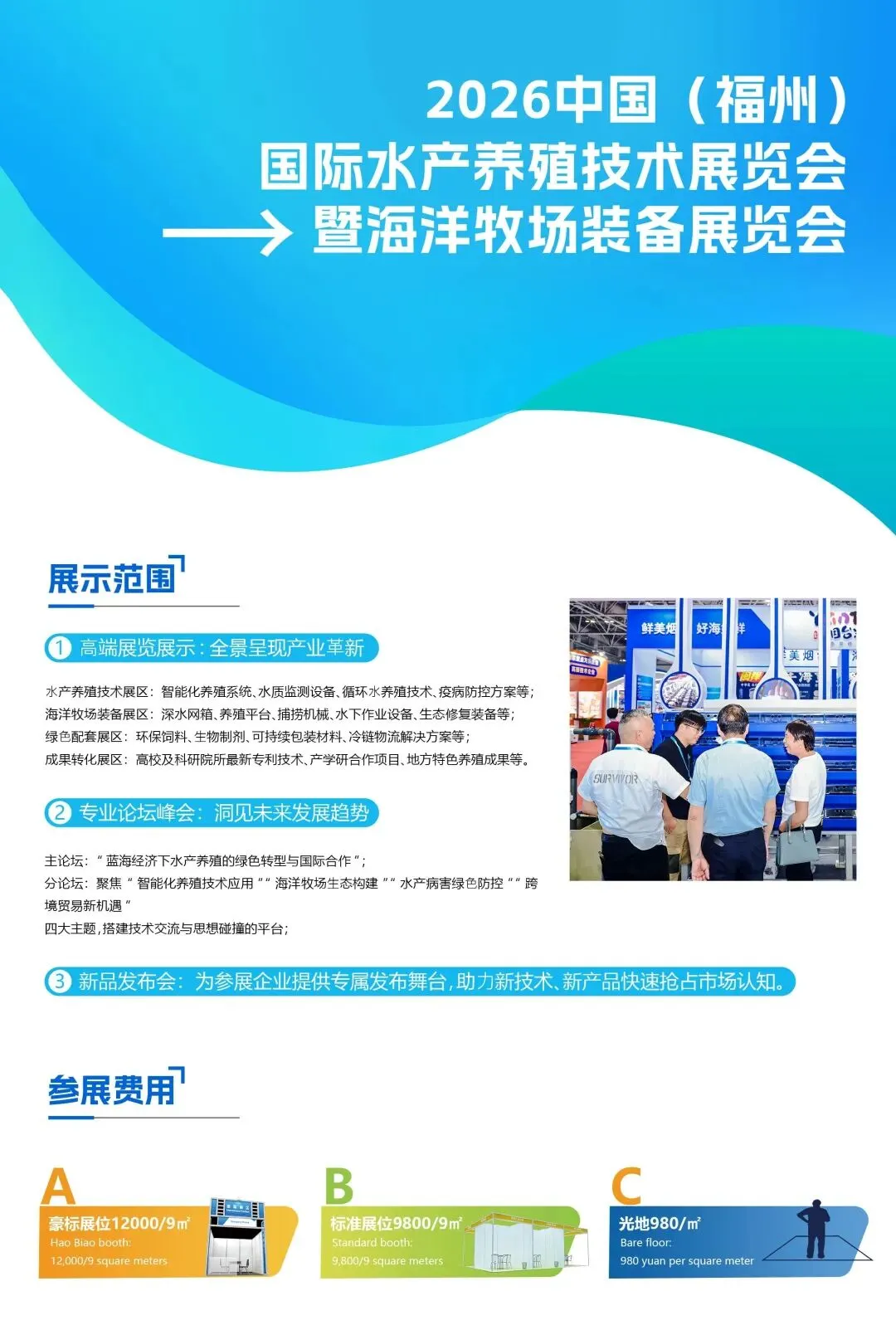 当蓝色经济成为全球发展的核心引擎,当水产养殖技术迈入智能化、绿色化新纪元,福州--这座坐拥闽江入海口、深耕海洋产业数十年的滨海名城,正以开放姿态搭建国际合作桥梁。2026中国福州国际水产养殖技术展览会暨海洋牧场装备展览会定于2026年6月12-14日在福州海峡国际会展中心盛大启幕。我们诚挚邀请您作为参展商、专业观众或合作伙伴,共赴这场汇聚全球智慧、链接产业上下游的行业盛会!
