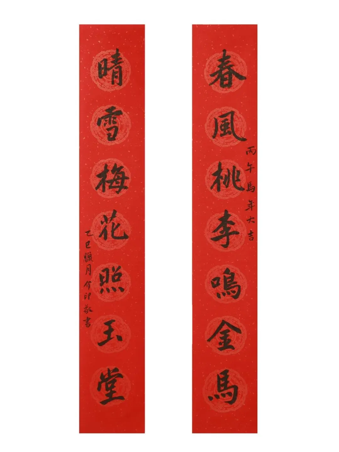 释文:春风桃李鸣金马;晴雪梅花照玉堂。