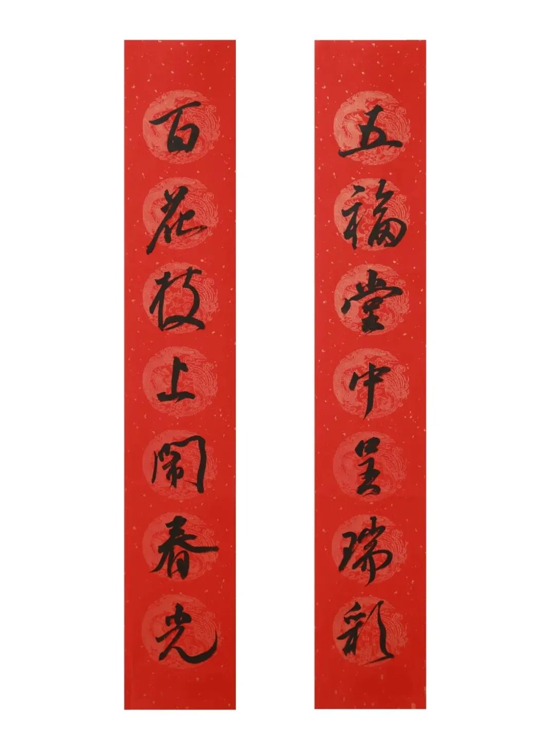 释文:五福堂中呈瑞彩;百花枝上闹春光。