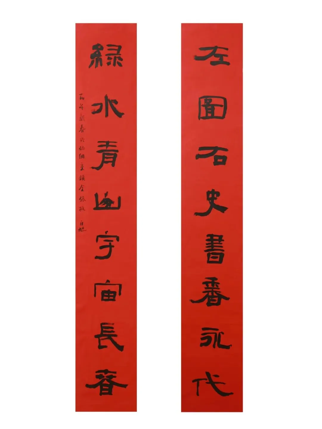 释文:左图右史,书香永代;绿水青山,宇宙长春。