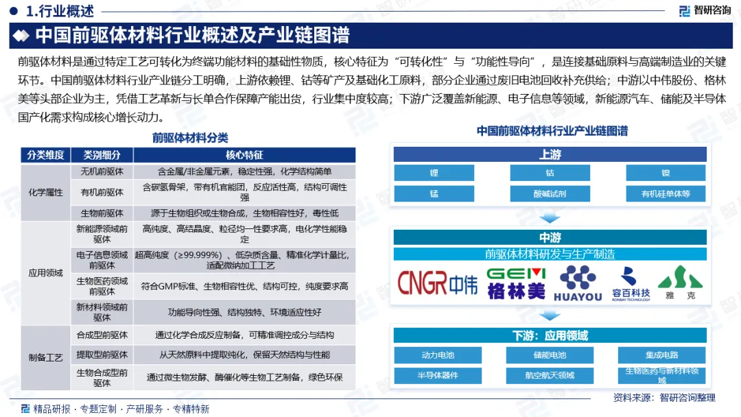 行业概述:前驱体材料(Precursor Materials)是指在特定工艺条件下,通过化学、物理或生物转化反应,可制备目标功能材料、终端产品或中间产物的一类基础性、先导性物质。其核心特征在于“可转化性”和“功能性导向”——自身可能不直接具备终端产品的核心性能,但通过后续加工(如烧结、沉积、聚合、催化反应等),能形成具有特定结构、性能的终端材料(如半导体材料、陶瓷材料、新能源电极材料、生物医用材料等)。