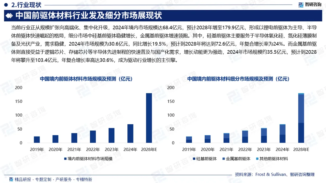 前驱体材料市场规模:在全球新能源革命与“双碳”目标的战略驱动下,新能源汽车、储能、半导体等战略性新兴产业已成为经济增长与产业升级的核心引擎。前驱体作为这些高端产业的“核心基础材料”,其自主可控与技术进步直接关乎国家产业安全与竞争力。当前,我国前驱体材料行业正经历从规模扩张向结构高端化、格局集中化升级的关键跃迁阶段,市场空间广阔。数据显示:2024年我国境内前驱体材料市场规模已达68.4亿元,同比增长25.7%,预计到2028年将增至179.9亿元,展现出强劲的增长潜力,并已形成以锂电前驱体为主导、半导体前驱体快速崛起的产业格局。