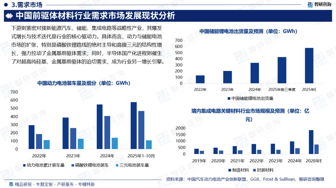 动力电池市场:作为前驱体材料的最大消费市场,新能源领域需求核心聚焦新能源汽车动力电池与储能电池两大场景,金属基前驱体(三元NCM/NCA、磷酸铁锂前驱体)成为绝对核心需求产品,其性能直接决定电池能量密度、循环寿命与安全性。数据显示,2025年1-10月国内动力电池累计装车量达578.0GWh,累计同比增长42.4%,持续保持高增态势;细分电池类型中,磷酸铁锂电池凭借成本优势与安全特性占据主导,累计装车量470.2GWh,占总装车量的81.3%,累计同比大幅增长59.7%,直接拉动磷酸铁锂前驱体需求激增;三元电池虽累计装车量107.7GWh(占比18.6%)、同比小幅下降3.0%,但高端车型对高能量密度的需求推动8系及以上高镍三元前驱体占比持续提升,为金属基前驱体市场提供结构性增长动力。