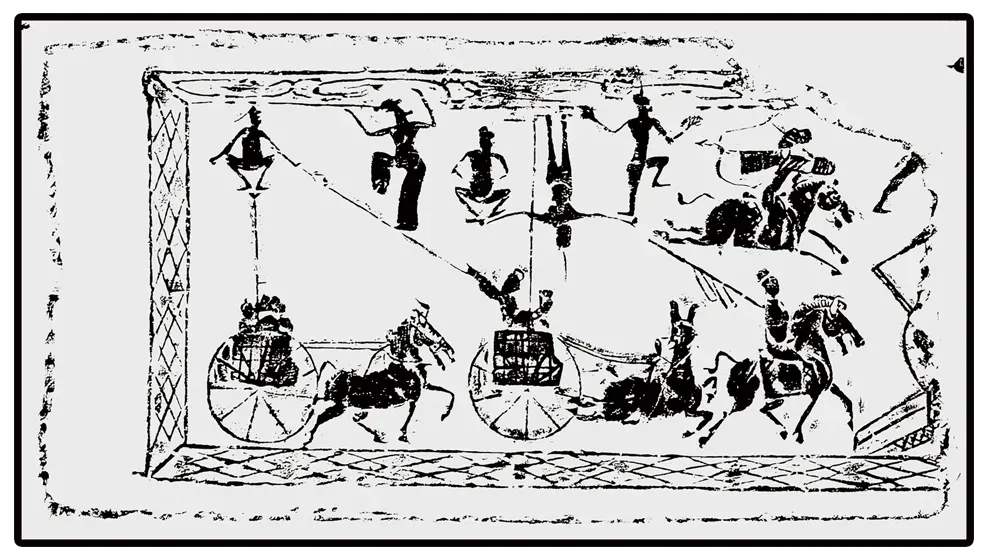 南阳新野汉画像砖 斜索系车、杂技