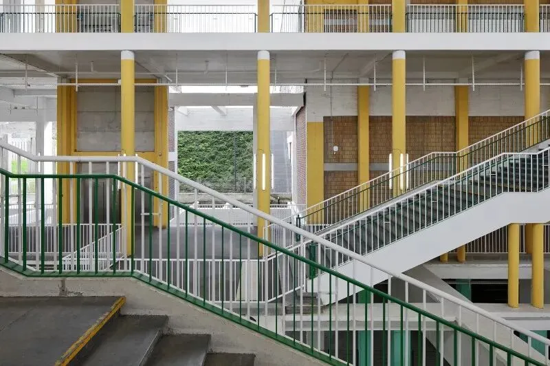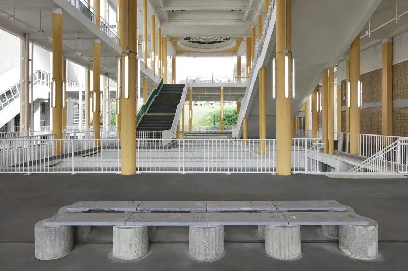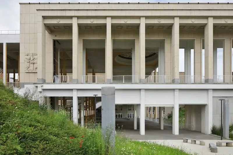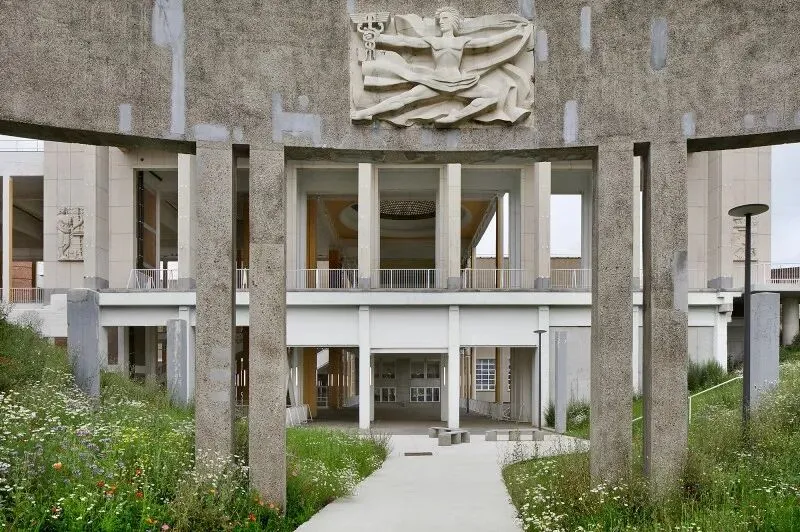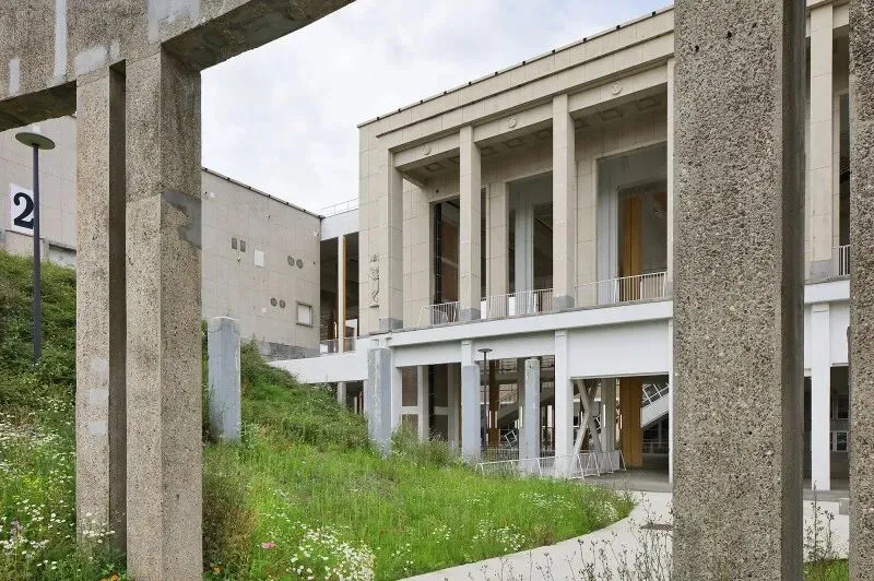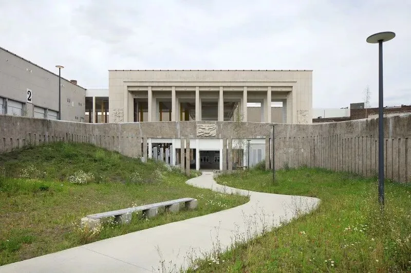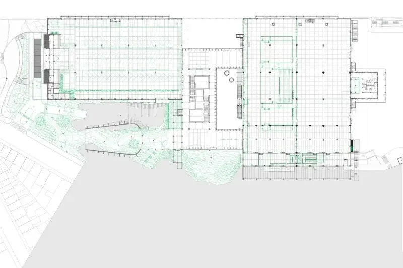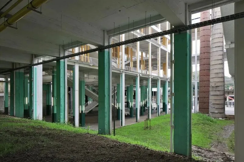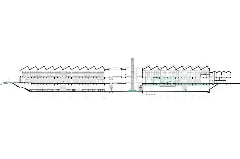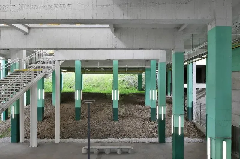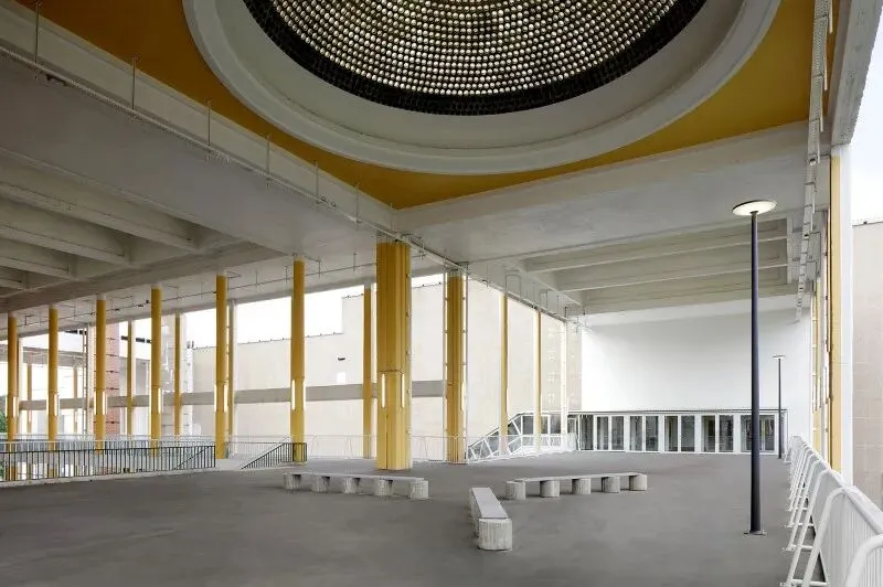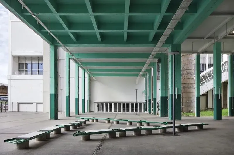 尊重性再利用原则贯穿项目始终,通过发掘与强化既有特质,形成一种平衡经济、生态与美学的建筑考古学实践。建筑干预仅限于精准的点状介入:例如通过叠加双层绿色栏杆来满足现行安全规范;将拆除构件转化为城市家具;采用白色抗碳化涂料保护原有混凝土;表面按原功能色彩编码重新涂装(如网球场沿用绿色),既恢复场所记忆,又帮助人们重新认识焕新后的建筑。项目限制特殊技术的使用,积极引入自然通风。材料选择注重耐久性与直接性,植被配置要求低维护。建筑原有的灵活性得到增强并延伸至未来,如今已成为展览宫的鲜明特征。本次改造并非终点,而是让建筑获得新生并持续演变的开端。
