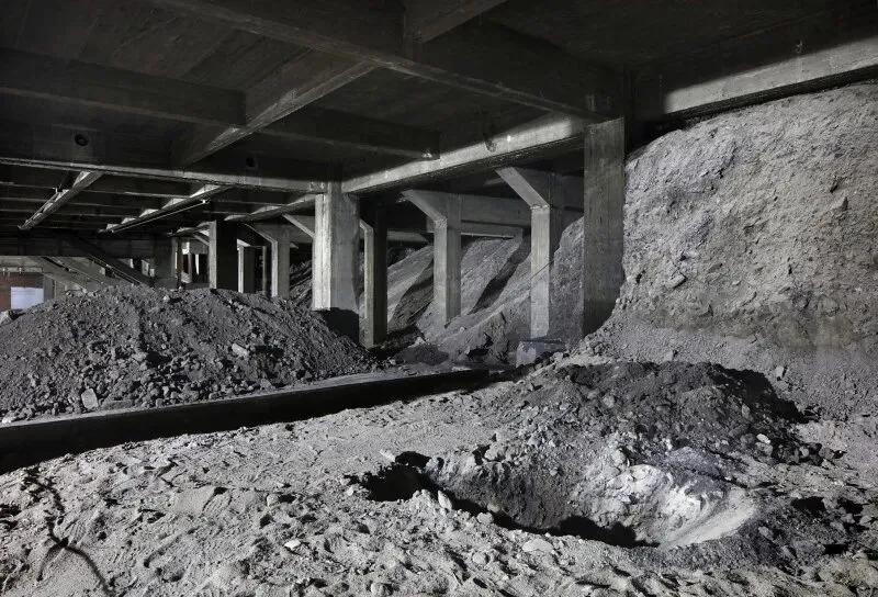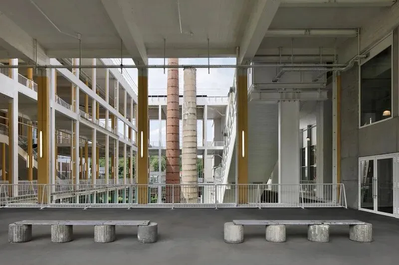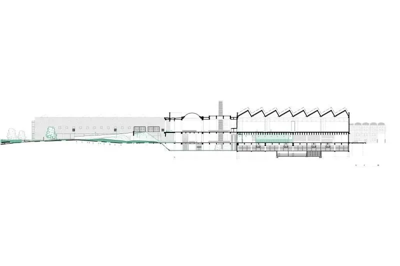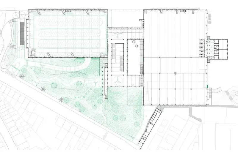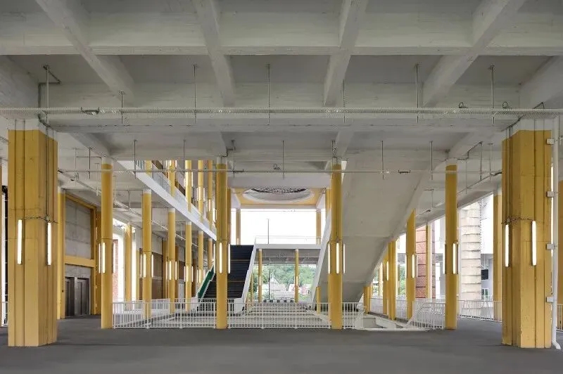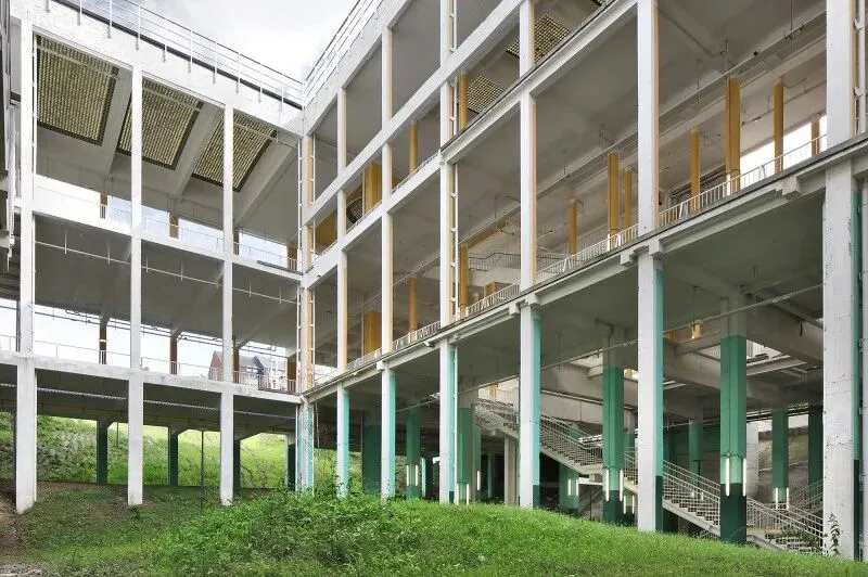 原方案建议用一座低能耗建筑取代中央大厅,但预算仅为所需资金的三分之一。因此最终改为开放中心区域并拆除立面,形成有顶盖的户外空间——这实质上构成了一个"零能耗"结构。通过在一楼开辟中庭,与昏暗的地下层连通,从而在项目核心区域打造出三层通高的立体花园。南翼被改造为多层停车场,进一步将热工围护结构缩减至北侧体量。经过深思熟虑的拆除工程衍生出诸多巧妙解决方案:例如自然通风的停车场楼层;或是拆除受损混凝土板,将停车区域转化为公园绿地。建筑所处的矿渣堆被暴露出来并播种乡土植物,形成生态丰富的景观。施工期间新增了整合会议中心的需求,为此增设的新阳台仿佛在向世人展示原始建筑的改造潜力。