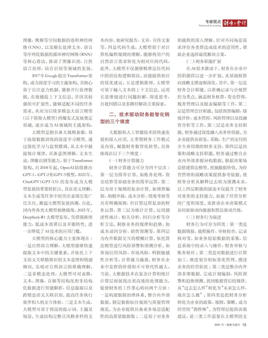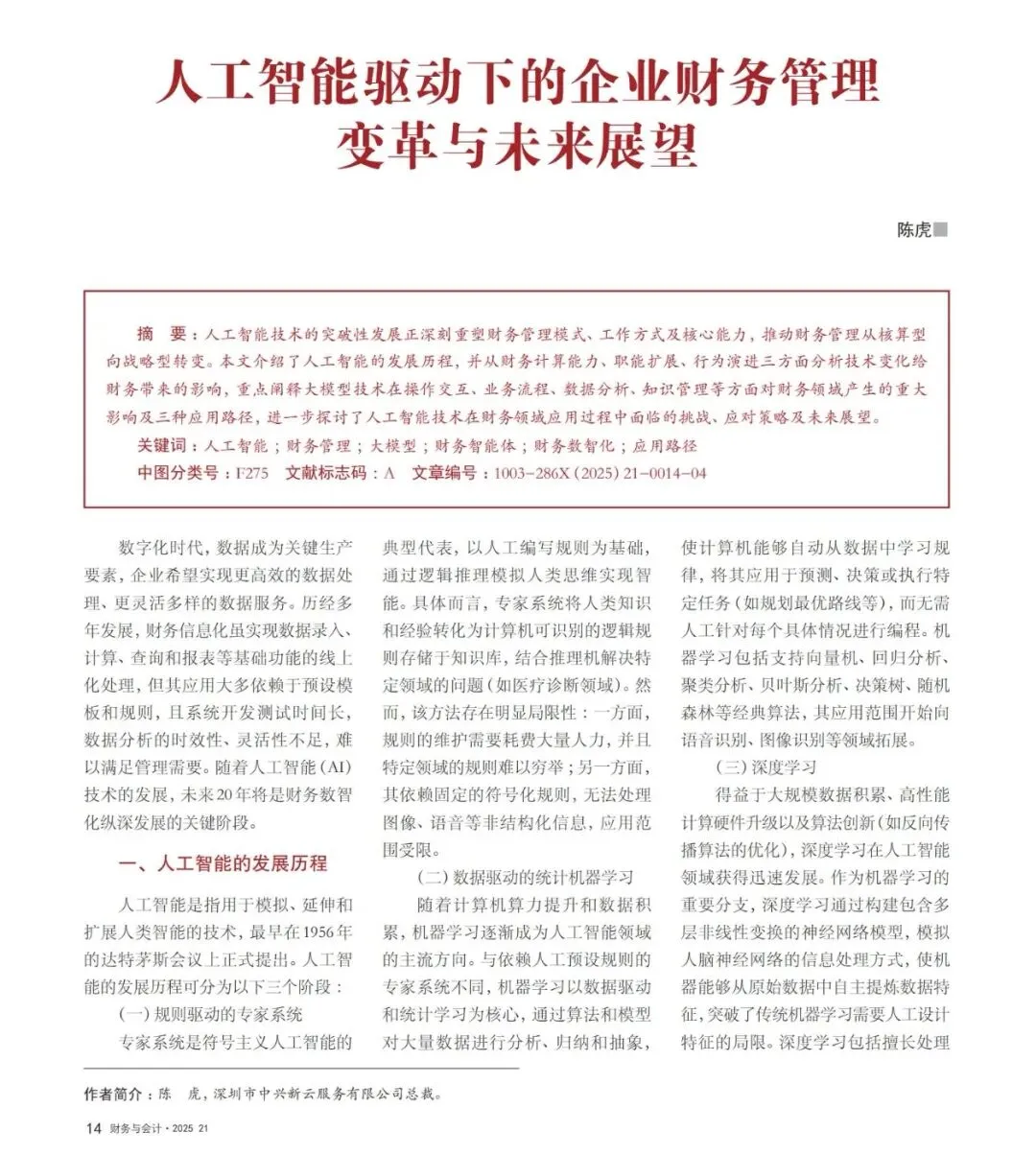 本文围绕人工智能对财务管理的影响展开研究,梳理了人工智能从规则驱动的专家系统、数据驱动的统计机器学习,到深度学习及大模型的发展历程,明确了大模型的核心能力。文章从财务计算能力、职能扩展、行为演进三个维度,分析了技术对财务数智化转型的驱动作用,重点探讨了大模型在财务操作交互、业务流程、数据分析、知识管理方面的四大变革及三大应用路径,同时指出了数据安全、结果可靠性、技术人才短缺等应用挑战及应对策略,对财务智能体引领财务认知智能发展的未来进行了展望,为企业财务数智化转型提供了参考。