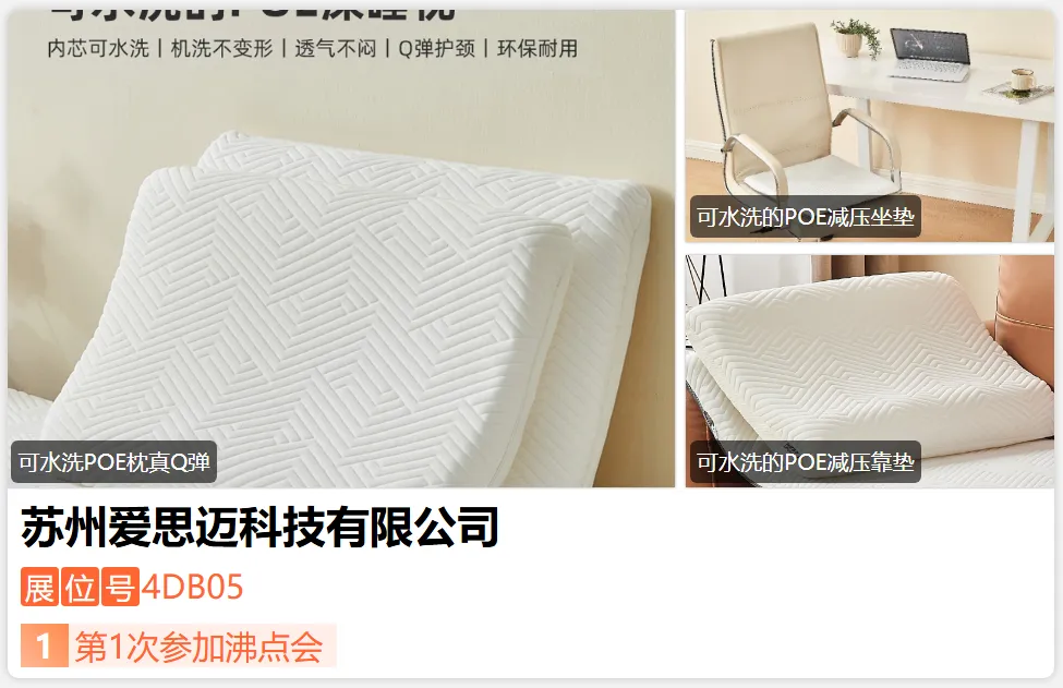 苏州爱思迈科技有限公司(AIRSMART)是一家聚焦可水洗POE深睡枕的创新型科技企业,拥有核心技术配方,致力于于通过材料研发与智能技术融合,为全球客户提供兼具舒适性、功能性与健康属性的睡眠解决方案。爱思迈可水洗POE深睡枕,内芯可水洗,机洗不变形,透气不闷,Q弹护颈独特配方——解决POE枕硬邦邦触感难题,CMA权威检测环保安全,一上市就倍受国内外客户的好评。-展位号:4DE21-