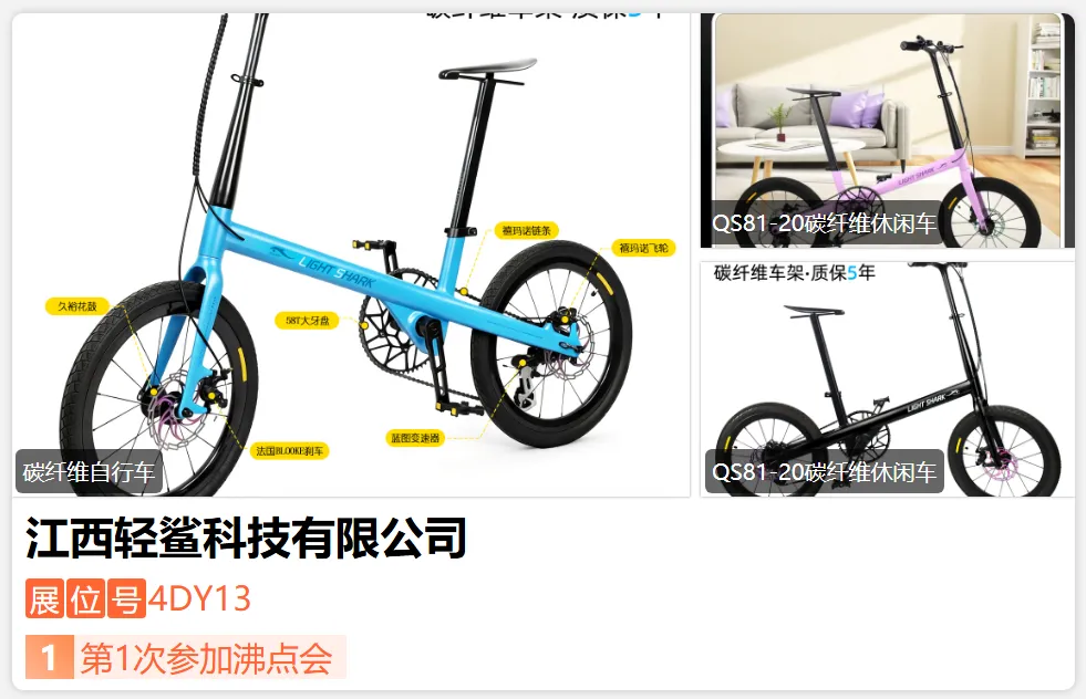 轻鲨(Light Shark)——一个以”轻如风,快如鲨”为核心理念的高端碳纤维自行车品牌。品牌名称”Light Shark”寓意深刻:“Light”代表对***轻量的不懈追求,每一克重量的削减都是对材料科学的挑战;“Shark”则象征着在公路上破风前行的迅猛与优雅。轻鲨自行车---科技与艺术的***融合,摆放在家中或办公室,都仿佛是立体的***名画,彰显主人的品味与对生活品质的追求。-展位号:4DX17-