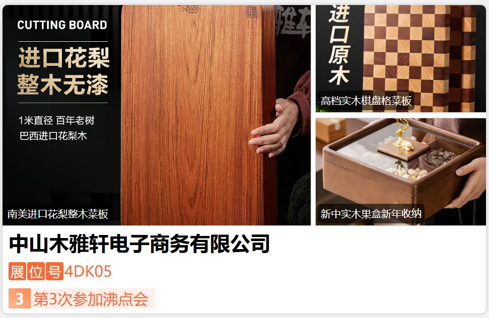 木雅轩,始于1997年,深耕实木用品领域,专注于新中式厨房家居用品,秉承健康生活理念,打造高品质家居精品。 1.产品线与销售渠道:产品涵盖菜板、果盘、首饰盒、茶盘等,线上线下融合,天猫、京东、抖音视频号品牌旗舰店均获高分好评; 2.品质保障与创新:每一种木材均附有进口海关单,确保纯正血统;每一款产品均通过权威机构检测,品质无忧。入驻了网易严选,与抖音视频号头部达人都有合作。-展位号:4DK03-