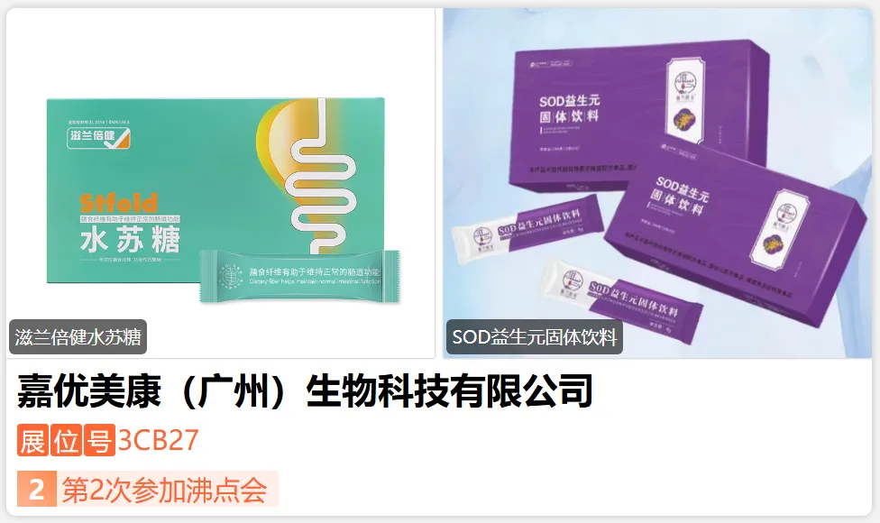 嘉优美康(广州)生物科技有限公司,是河北健宝生物科技有限公司的广东办事处,同时兼具供应链核心优势。河北健宝深耕益生元大健康领域,由何龙领衔研发团队,持多项国家专利,自研自产水苏糖、SOD益生元等肠道调理产品,自有原料供应链,可贴牌代加工。嘉优美康依托总厂实力,联动渠道与生产,为客户提供一站式益生元产品解决方案,合作覆盖全国连锁养生会所等众多渠道。-展位号:3CX09-