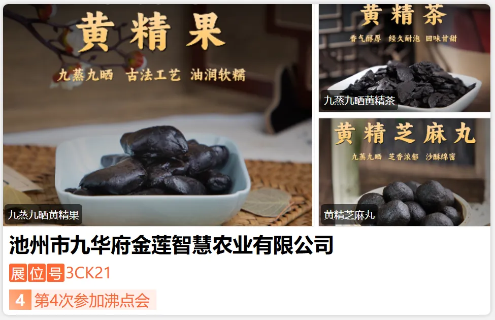 池州市九蒸晒食品集团有限公司,从事黄精种植、加工、销售及黄精产品研发一二三产融合发展的企业。秉持“集团有限多元化、子公司经营专业化”的发展战略,公司旗下设有4家控股子公司:池州市联众农业有限公司、池州市丰浩农业有限公司、池州市九华府金莲智慧农业有限公司、池州市适四时农业股份有限公司,销售黄精茶、黄精果、黄精丸、黄精原浆、黄精膏、黄精酒、黄精抱枣40余款产品。-展位号:3CL27-