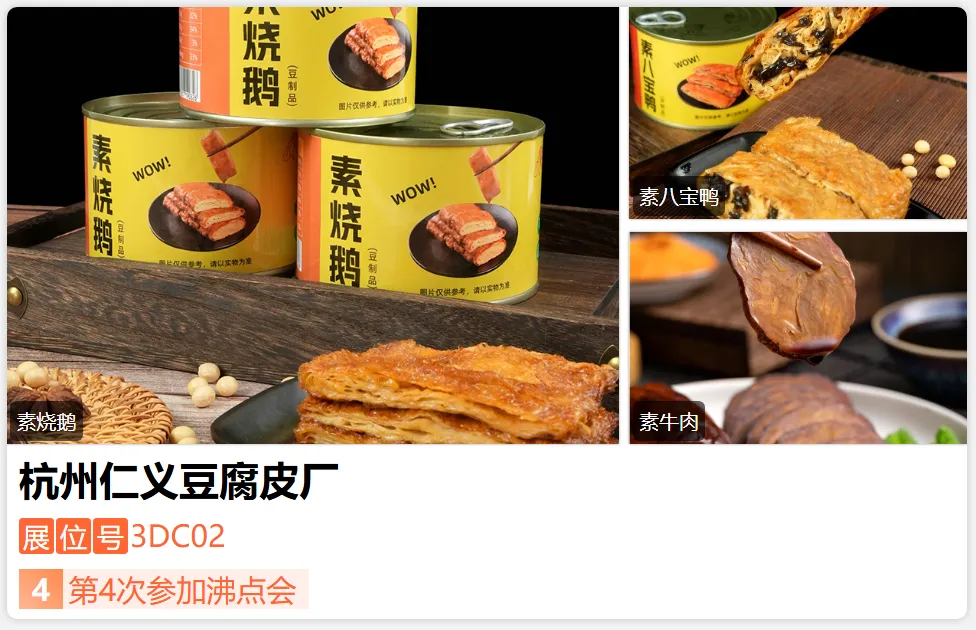 杭州仁义豆腐皮厂有两大生产基地,浙江杭州和安徽宣城,自有工厂。杭州工厂始建于2000年,位于浙江杭州,浙江省非物质文化遗产地,公司主营“玉蝉牌 ” 豆腐衣及深加工系列食品,如素烧鹅,素牛肉,素肠,响铃卷等都是市场爆款。目前合作渠道盒马,叮咚,连锁商超,连锁火锅店等。-展位号:3DL15-