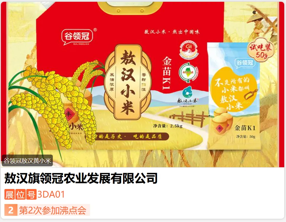 国家地标产品:在清朝时期,敖汉就是皇宫贡米产地;种植史距今8千多年,被国内外誉为 世界小米之乡;央视广告:敖汉小米 熬出中国味;有机,不打农药,身处内陆、纬度高光照足、温差大,沙地多 独特的气候和土壤,加上古法种植,颗粒饱满,古色谷香;属米中上品;富含蛋白质、维生素、矿物质、氨基酸,是滋补身体、平衡膳食、调节口味的佳品。-展位号:3DC09-