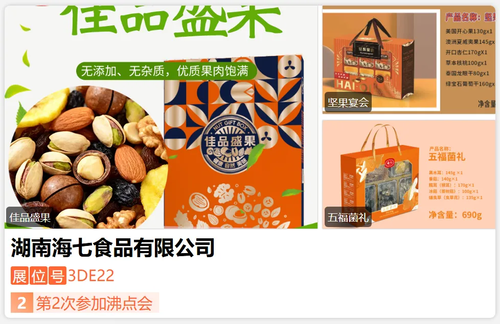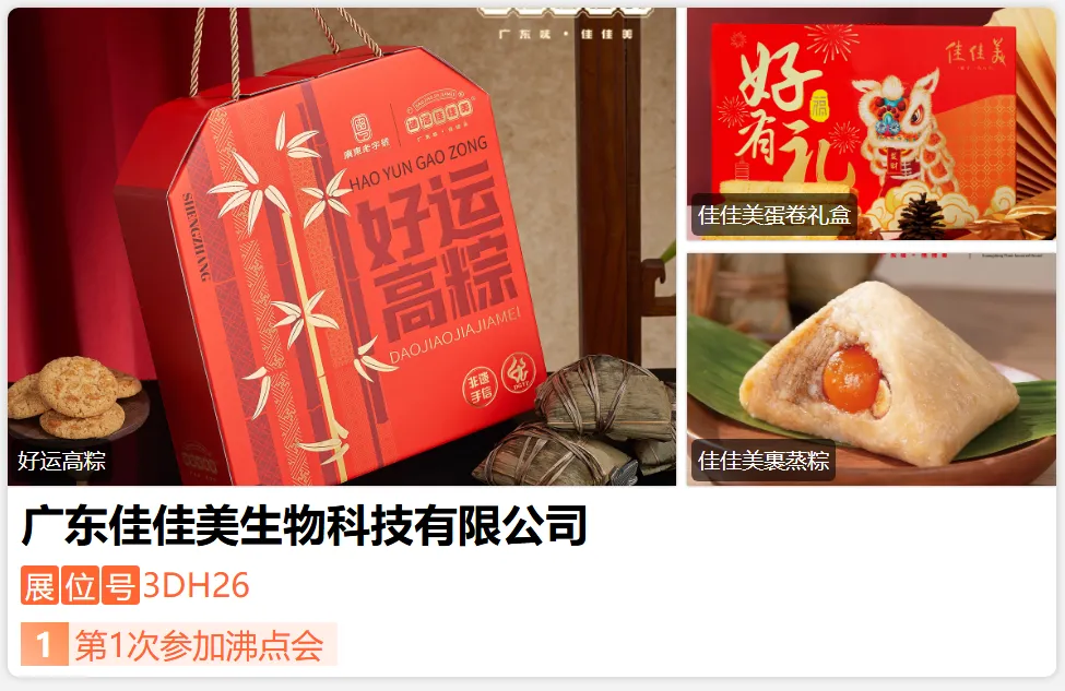广东佳佳美生物科技有限公司,始终秉持现代化经营理念,致力于传承和创新东莞美食文化。佳佳美成功通过ISO9001、HACCP以及SEDEX等权威管理体系认证,将现代管理理念导入传统行业,力求将“佳佳美”打造成“非遗手信”的高质量品牌。2024年,道滘佳佳美荣获“广东老字号”称号,这是对其40年坚守品质、传承创新的高度认可。-展位号:3DD21-