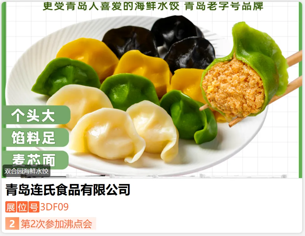 青岛双合园,更受青岛人喜爱的海鲜水饺,青岛老字号特色美食。全国有30多家直营门店,拥有非常好的口碑。从原料到生产,整条产业链严格把控,自有工厂,真正的源头工厂。主营业务涵盖纯手工海鲜水饺与手工馄饨等,不断优化传统工艺,陆续推出食养系列、地标产品系列等新产品,以真材实料与独特口味赢得广大消费者的信赖与喜爱。-展位号:3DL01-