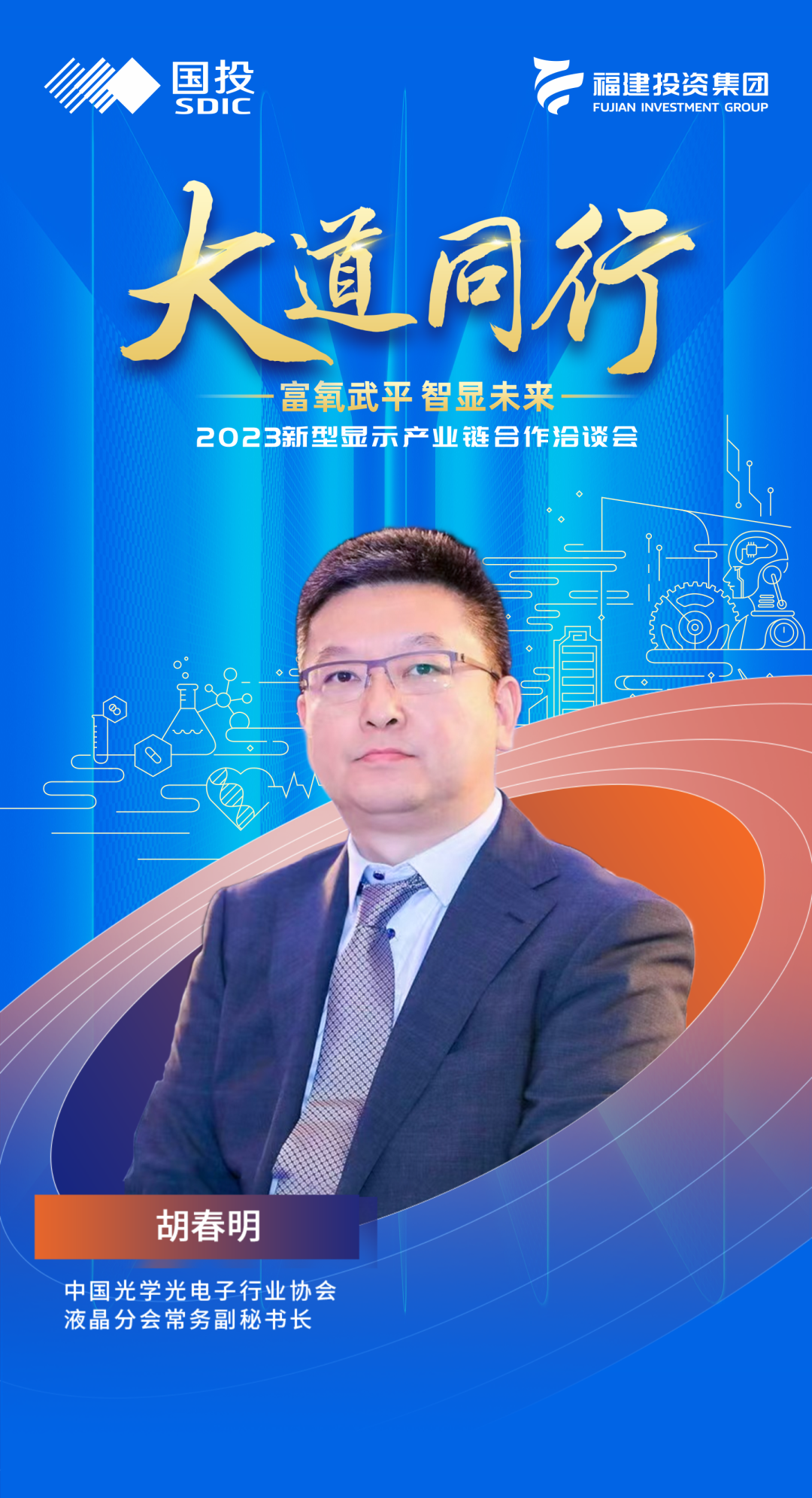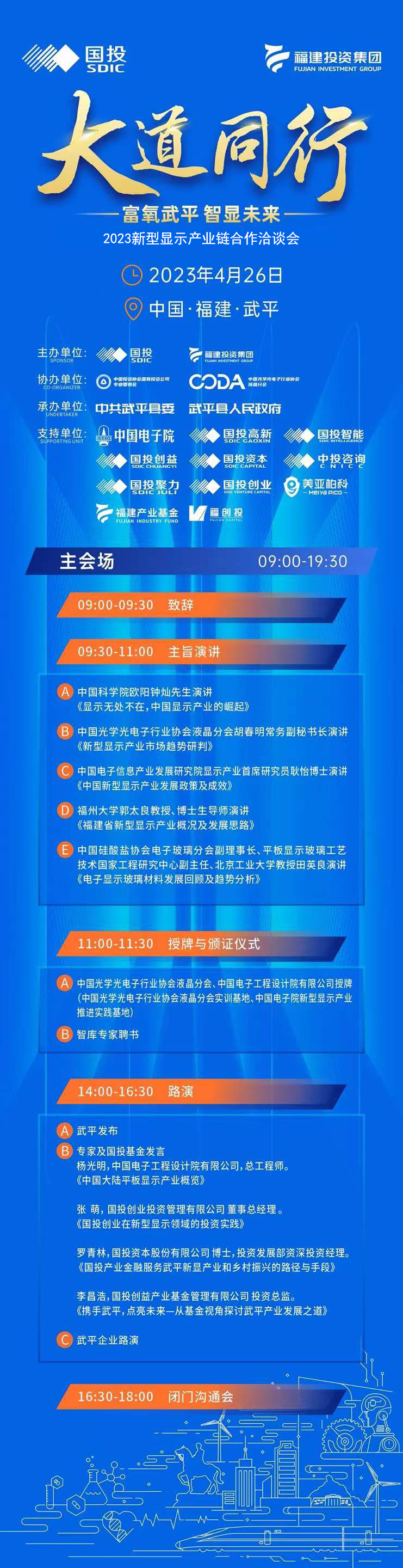 “大道同行——富氧武平 智显未来 2023新型显示产业链合作洽谈会”将于2023年4月26日,在国投集团和福建投资集团的对口支援县——福建省龙岩市武平县举行。本次会议由国投委会员国投集团与福建投资集团联合主办,中国投资协会国有投资公司专业委员会与中国光学光电子行业协会液晶分会协办,福建武平县委、县政府承办。