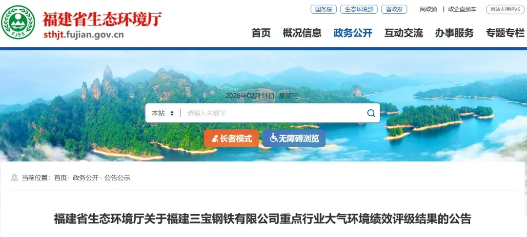 2026年2月10日,《福建省生态环境厅关于福建三宝钢铁有限公司重点行业大气环境绩效评级结果的公告》发布。福建三宝钢铁有限公司被评定为重点行业大气环境绩效A级企业。具体情况如下: