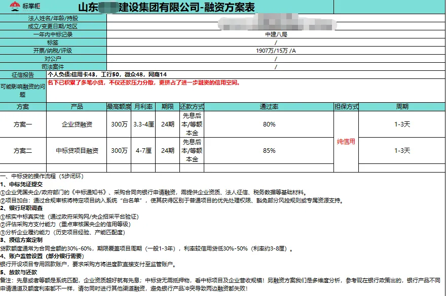 针对该公司的现状,我们定制了“中标贷”操作方案,成功盘活了中标中建项目的信用价值。