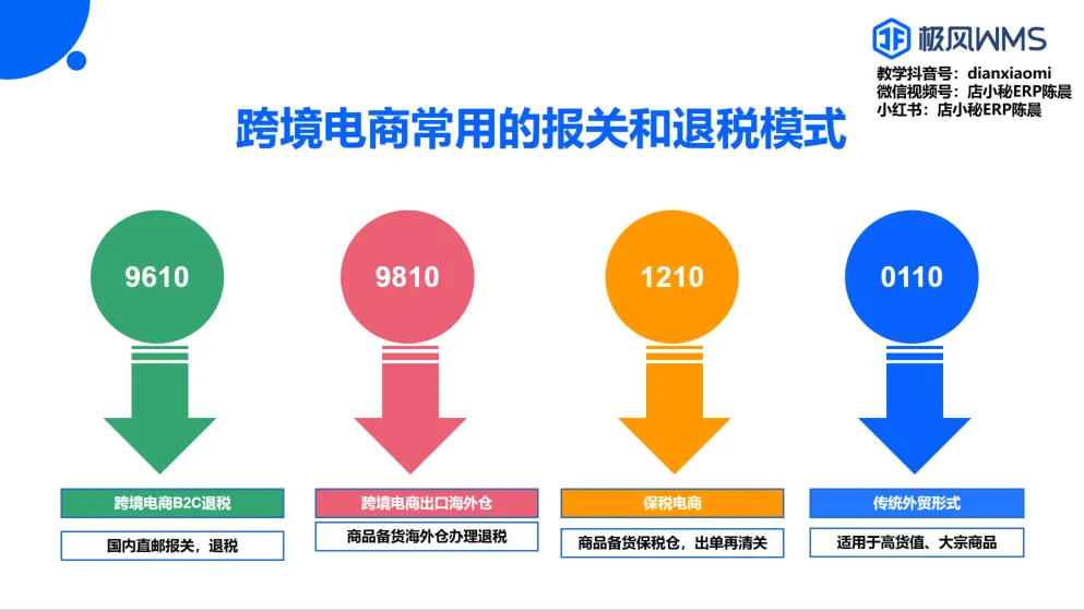 ? 总结: 小包直邮:9610 ;海外仓备货:9810;保税仓周转:1210;大宗贸易:0110