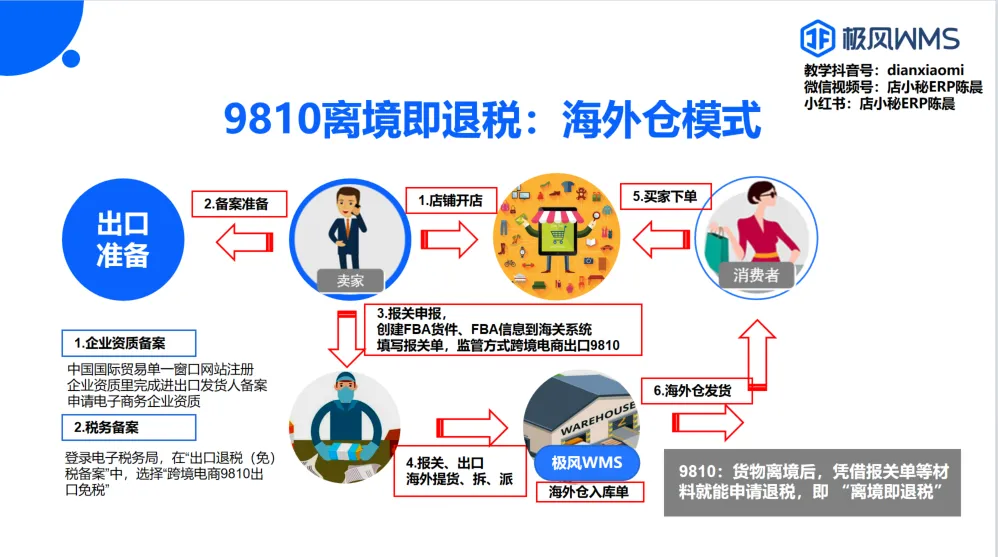 (2)报关出口(核心环节)①卖家发货到海外仓,不管是亚马逊FBA仓库,还是美客多full仓,或者是第三方极风WMS海外仓系统的仓库,卖家在把货物发往海外仓前,要把发货海外仓的货件信息、海外仓信息同步到海关系统,填写报关单,监管方式选择 “跨境电商出口 9810”。②货物离境后,凭借报关单等材料就能申请退税,这就是 “离境即退税” 的爽点!