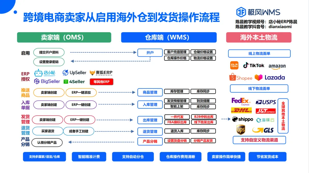 ①货物到目的国后,由海外仓提货、整柜直送、拆柜、打托、派送到FBA仓、full仓、或者其他第三方极风WMS的仓库;