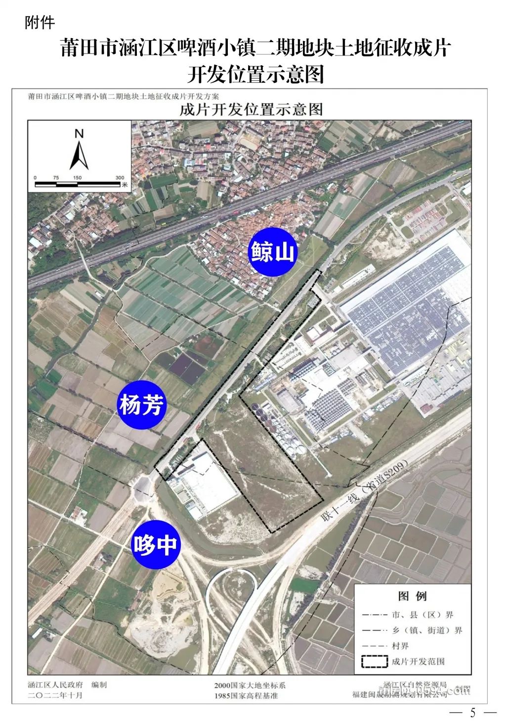 根据《中华人民共和国土地管理法(2019年修正版)》《自然资源部关于印发〈土地征收成片开发标准(试行)〉的通知》(自然资规〔2020〕5号)、《福建省自然资源厅关于印发〈福建省土地征收成片开发方案报批实施细则(试行)〉的通知》(闽自然资发〔2021〕3号)等有关规定,区政府组织编制《莆田市涵江区啤酒小镇二期地块土地征收成片开发方案》,并征求区人大代表、政协委员,有关专家、相关部门及乡镇、街道代表的意见。现将方案主要内容进行公示,征求成片开发范围内农村集体经济组织、村民及社会公众意见。在公示期间,对该方案的意见或建议请以书面等法定形式向区自然资源局反馈。