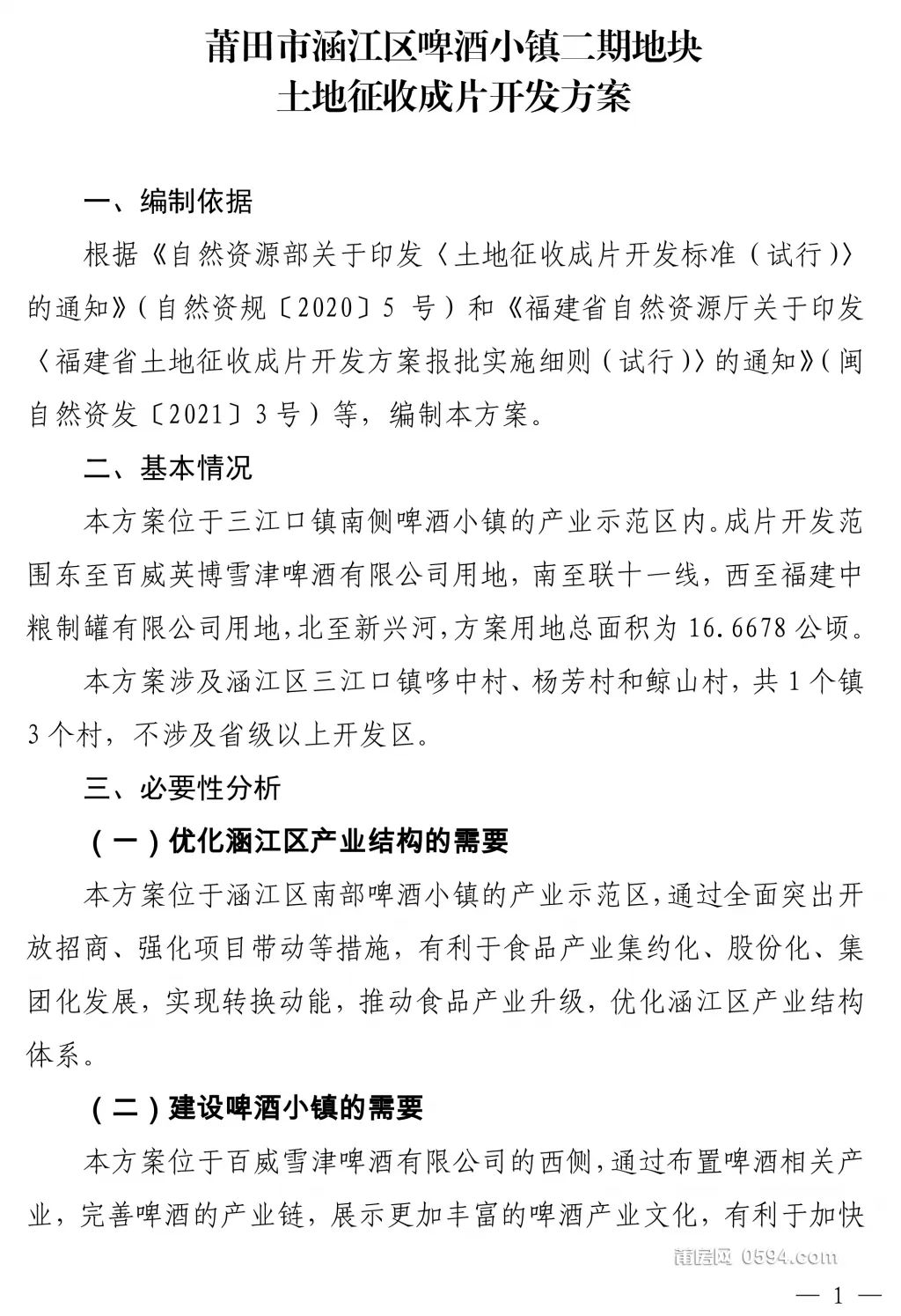 近日,莆田市涵江区人民政府关于莆田市涵江区啤酒小镇二期地块土地征收成片开发方案的公示 莆涵征成片公〔2023〕2号。其中,本方案涉及涵江区三江口镇哆中村、杨芳村和鲸山村,共 1 个镇3 个村,方案用地总面积为 16.6678 公顷。具体内容如下;