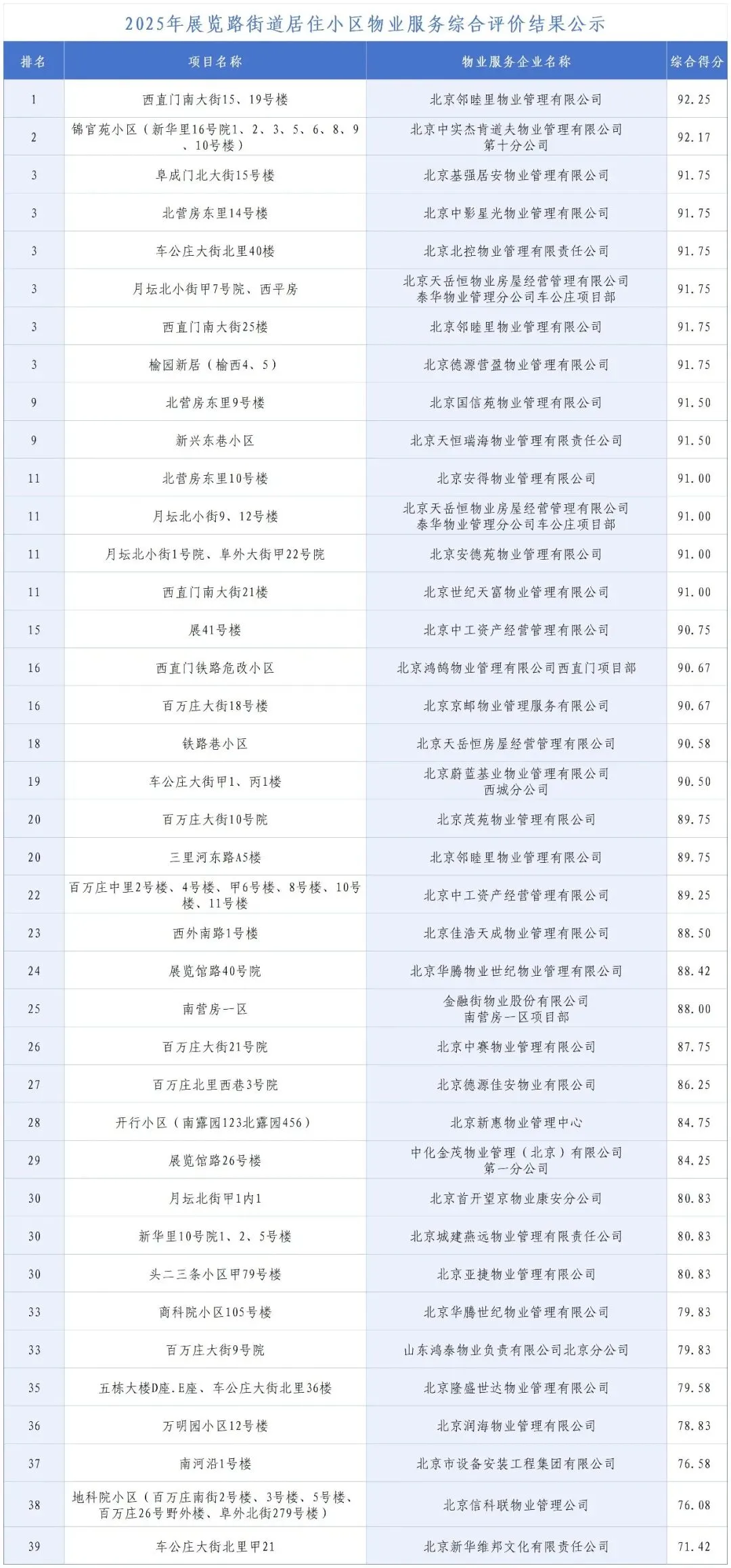 2025年展览路街道居住小区物业服务综合评价结果公示