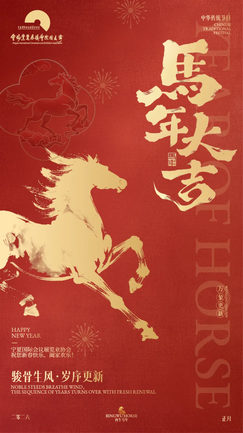 律回春渐,新元肇启。值此2026丙午马年新春佳节来临之际,宁夏国际会议展览业协会谨向长期以来关心、支持宁夏会展产业发展的各级领导、各界朋友,以及辛勤耕耘在一线的全体会展人,致以最诚挚的节日问候和美好的新春祝福!