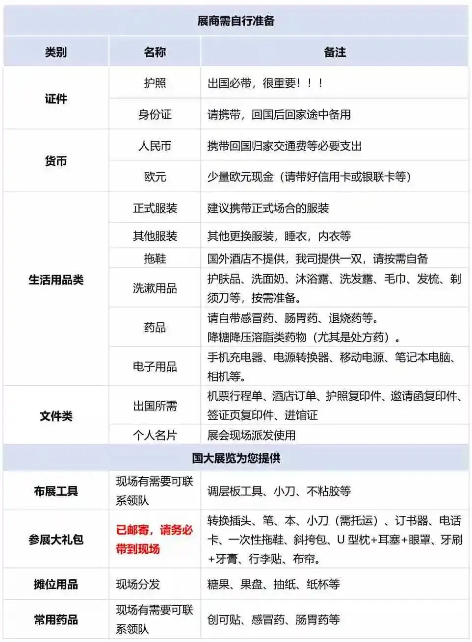 参展物品清单