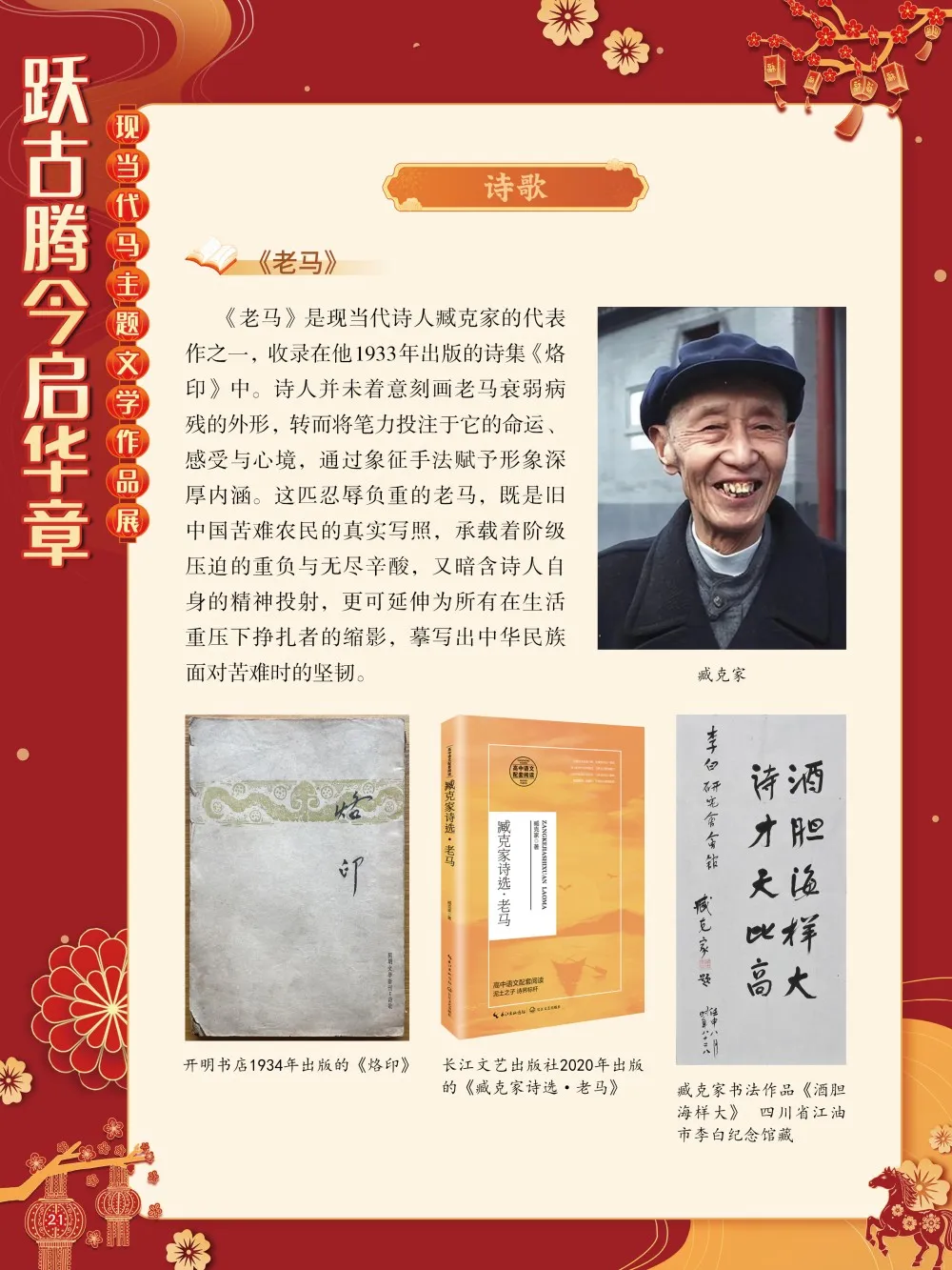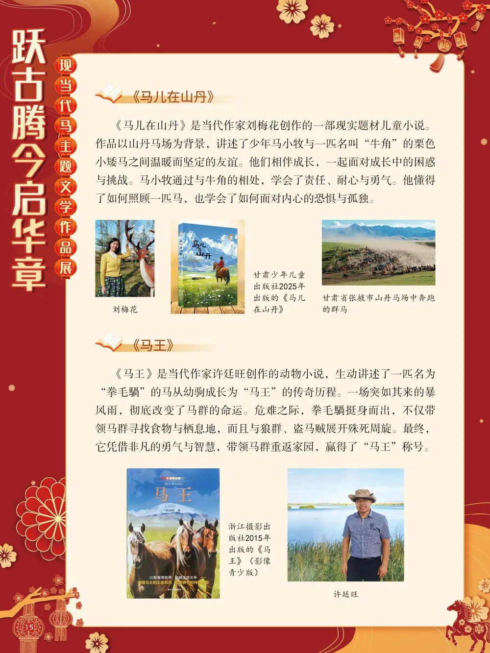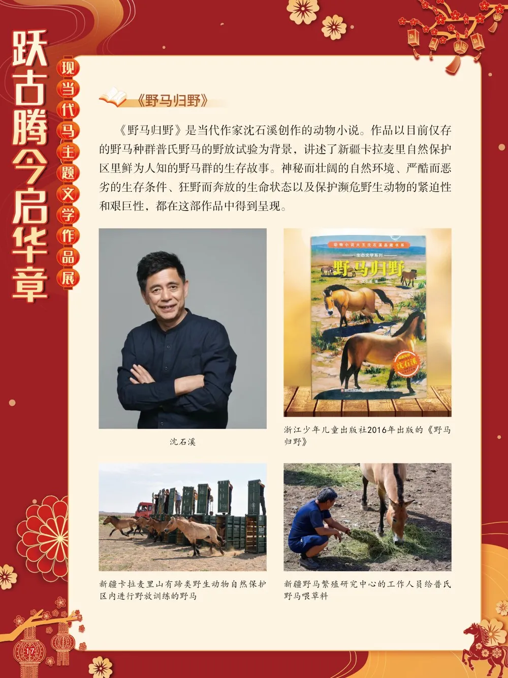 在现当代文学中,马的形象被赋予了更深层次的哲思与情感。它作为生命个体、精神图腾和情感载体,在广阔的文字世界里奔腾不息。“跃古腾今启华章——现当代马主题文学作品展”以马为线索,汇集现当代文学作品,带领大家一同走进这片文学的草原。愿马蹄的每一次腾跃,都能激发我们对生命的热爱与对自由的向往,引导我们感悟马的文化魅力,开启一段新的华彩篇章。