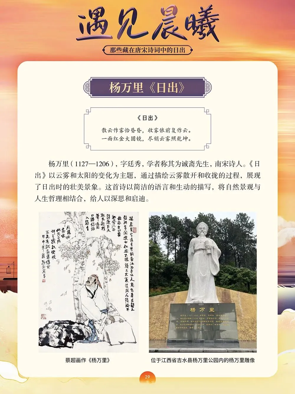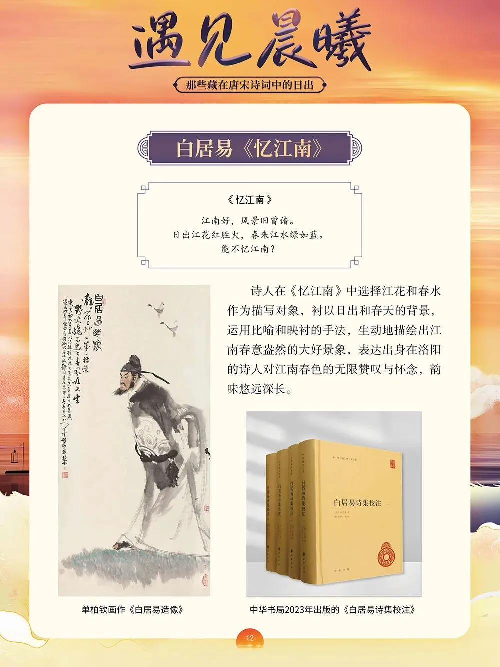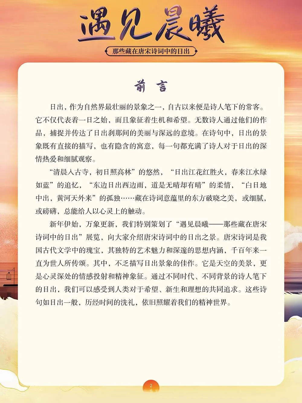 日出是自然与人文交融的经典意象:它既是一日时序的开端,更承载着生机与希望的精神内核。在唐宋诗词的笔墨里,日出被赋予多元的美感与意涵:既有“东边日出西边雨”的清新婉转,也有“日出江花红胜火”的明艳热烈,这些诗句或细腻描摹晨景,或暗藏情志,满含着文人对日出的深情体察。本展览以“唐宋诗词中的日出”为核心,梳理不同风格的日出意象,带大家循着诗行触摸古人笔下的晨曦之美,感受日出承载的希望与新生,在经典诗词的光影里,重拾跨越千年的精神共鸣。