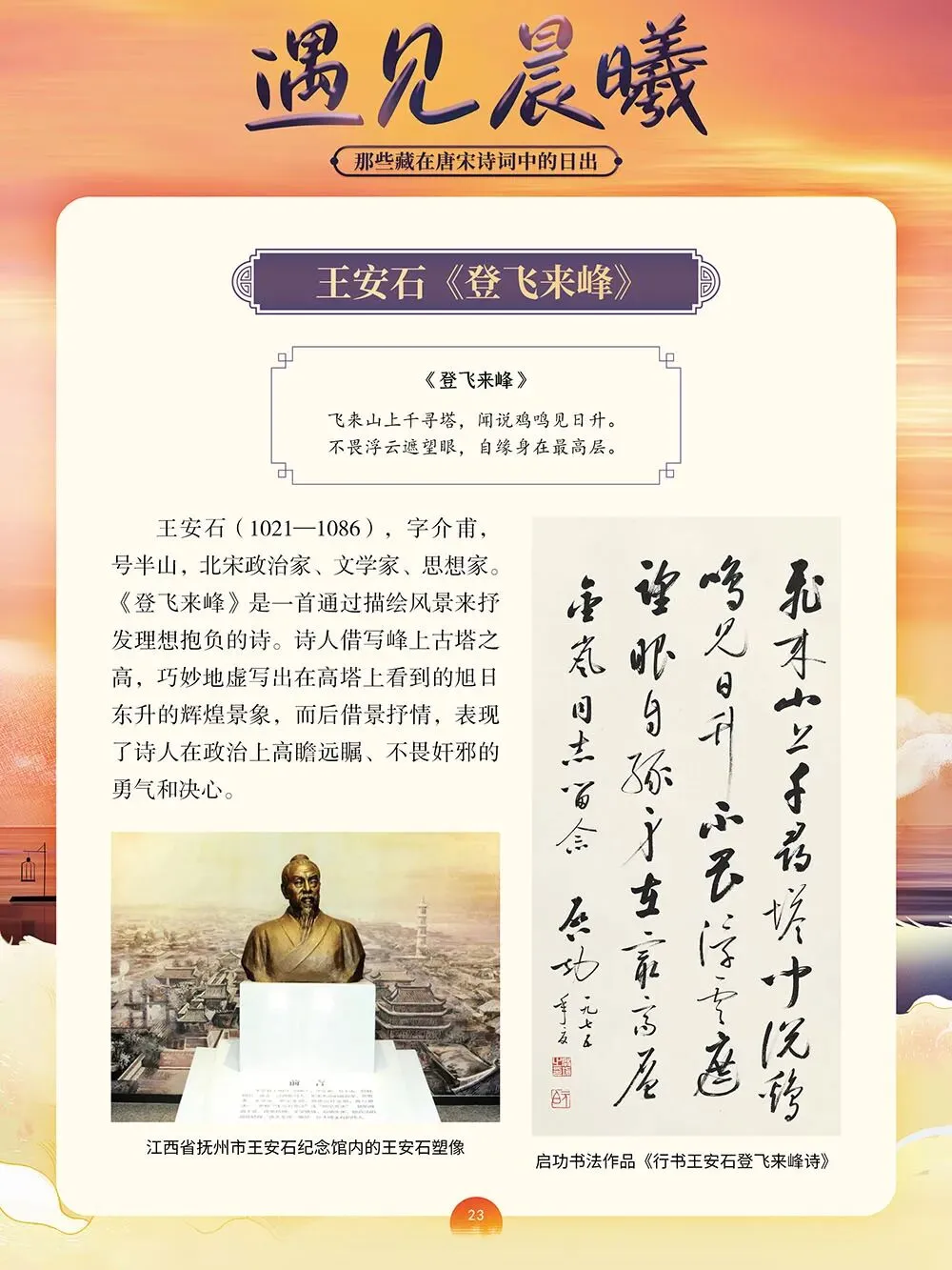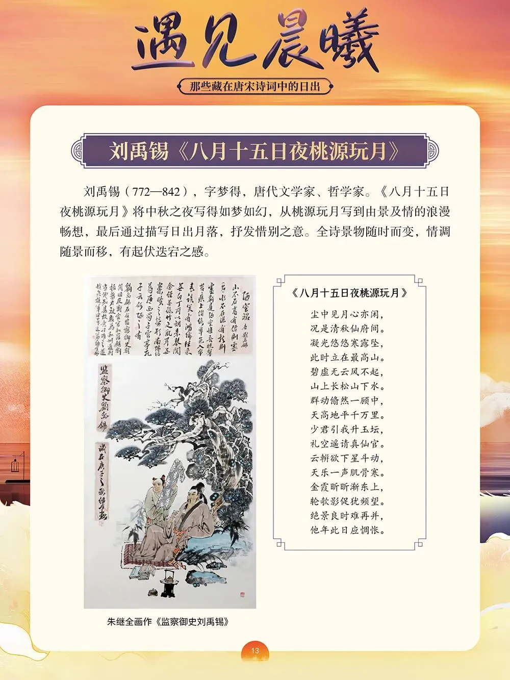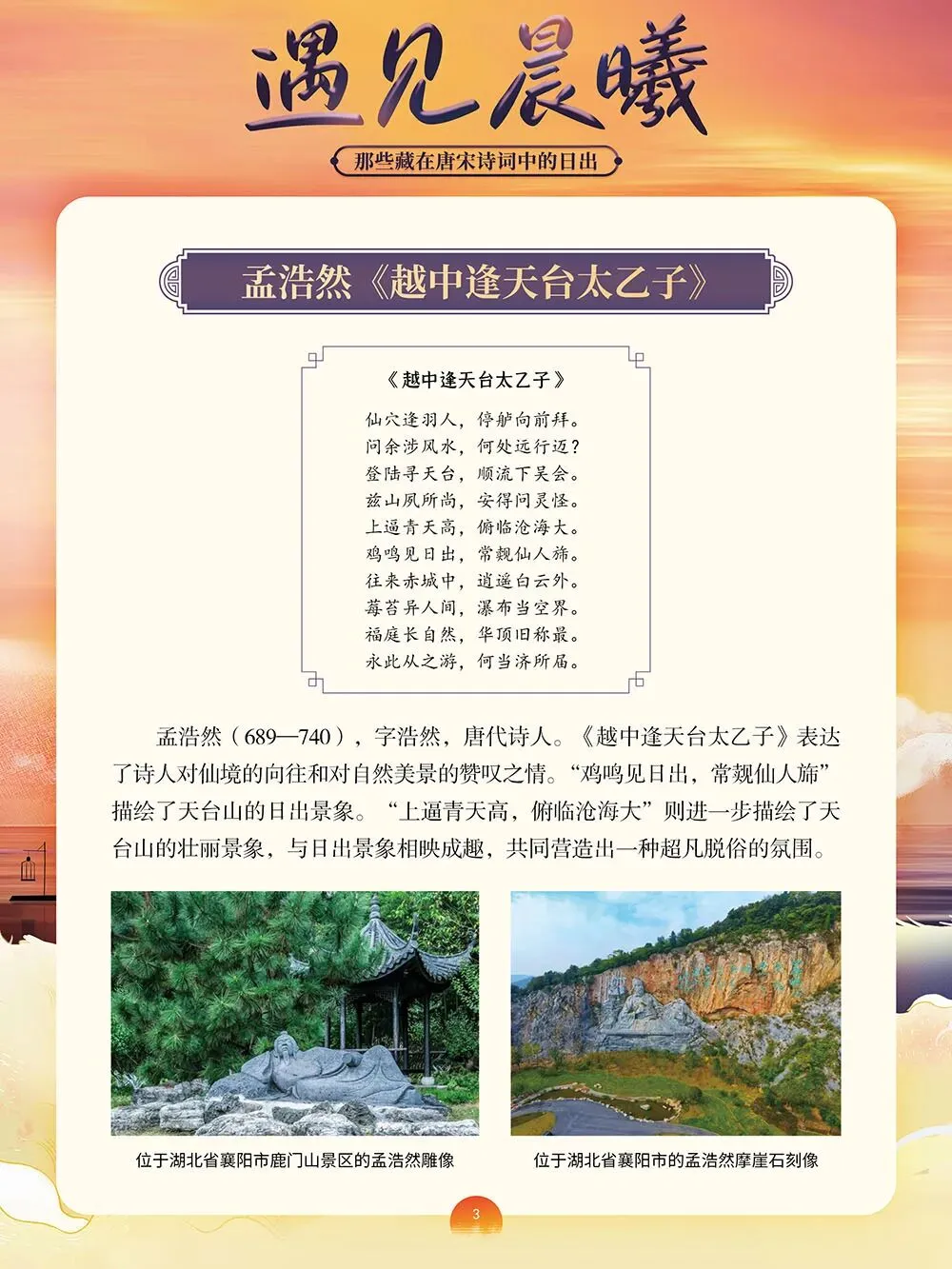 日出是自然与人文交融的经典意象:它既是一日时序的开端,更承载着生机与希望的精神内核。在唐宋诗词的笔墨里,日出被赋予多元的美感与意涵:既有“东边日出西边雨”的清新婉转,也有“日出江花红胜火”的明艳热烈,这些诗句或细腻描摹晨景,或暗藏情志,满含着文人对日出的深情体察。本展览以“唐宋诗词中的日出”为核心,梳理不同风格的日出意象,带大家循着诗行触摸古人笔下的晨曦之美,感受日出承载的希望与新生,在经典诗词的光影里,重拾跨越千年的精神共鸣。