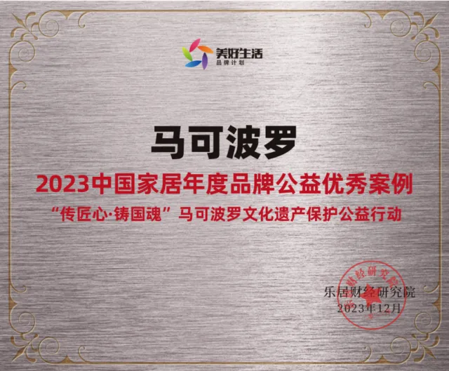 近日,2023(第七届)中国地产经理人评选荣誉发布会隆重举行,莞城工商联(商会)常委单位马可波罗控股“传匠心·铸国魂”马可波罗文化遗产保护公益行动入选“2023中国家居年度品牌公益优秀案例”。