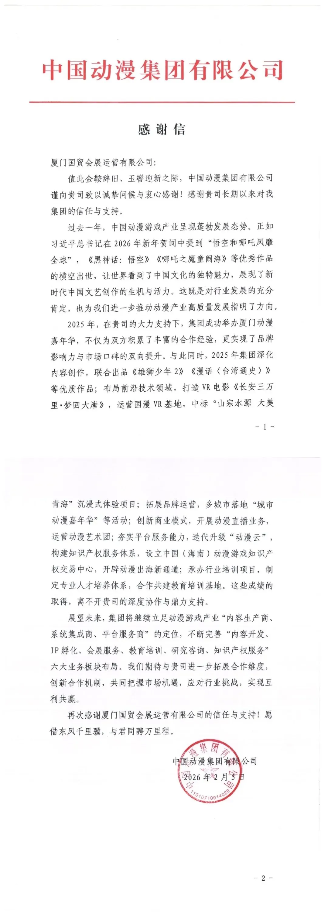 近日,中国动漫集团向国贸会展运营公司发出感谢信,对国贸会展运营公司深度协作与鼎力支持致以诚挚谢意,高度肯定双方携手举办厦门动漫嘉年华的合作成果,同时表达了未来持续深化合作、互利共赢的美好愿景。