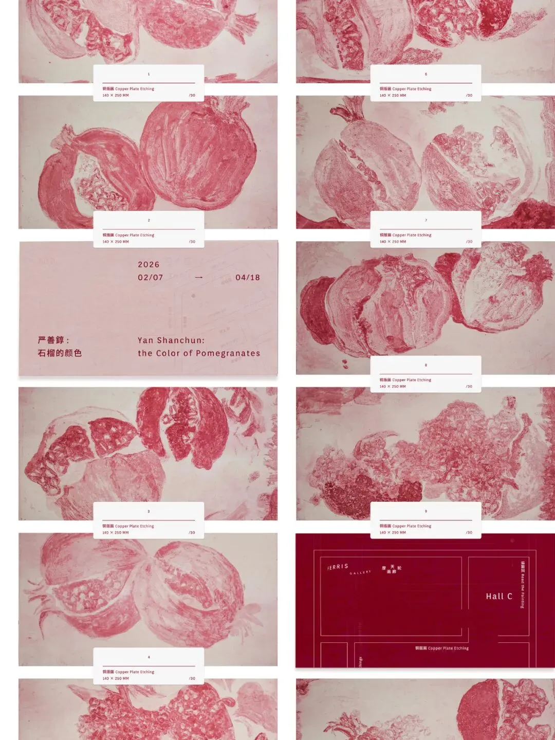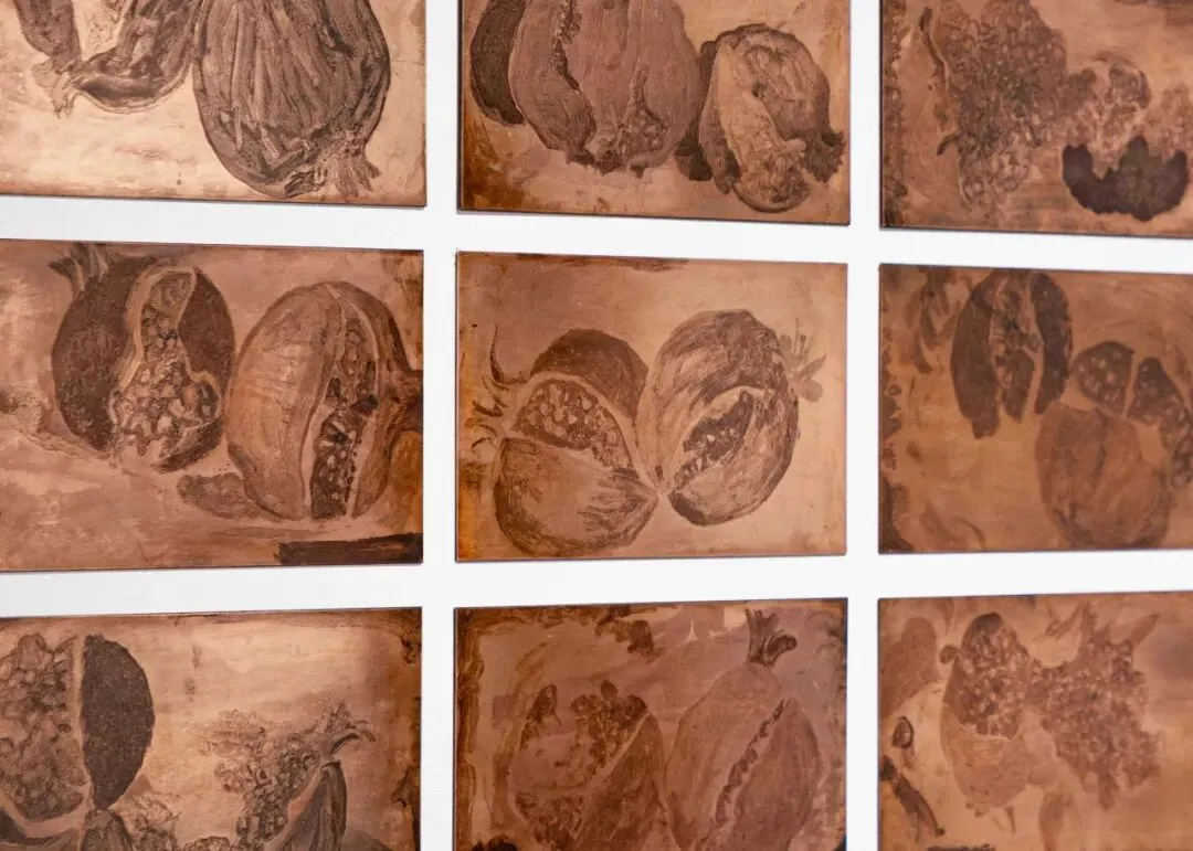 提起严善錞,西湖与他密不可分。温润、隽永的江南情调慵懒地流淌在薄如蝉翼的雁皮纸上,雨后草香、湖风微凉的临场体感自在地奔洒在画布上。从西湖边长大的严善錞把西湖带给他的情感投射在笔端,一直畅游在江南的山水之间,畅快写意。而今,严善錞停靠在西湖之滨小憩,品饮一杯香茶,把玩起一颗石榴。面对创作,严善錞有着极强的自我意识,从灵感初现直至作品完成,“把玩”二字在他的创作过程中尤为重要,也是创作之于严善錞的乐趣所在,绘画的动因不涉及超越自己,更不想打破前人,有的是对自己的取悦,自己画得开心了,看画的人也能照存自在愉悦的情绪,而石榴便是“把玩”的写照,作为文人雅士寄情于物的案头清供,从唐宋到明清再到今日,多籽的石榴仿佛是一个历史的碎片,夹带着时间的尘土与审美的光亮流传了下来。它演变成了一个精神的容器,承载着人类文化的美丽传说与想象,严善錞在这个容器里提取了最为鲜活的意象融入自己的作品中,即为饱满的生命活力。纵观《石榴的颜色》,每一对石榴从鲜艳饱满到炸裂迸发,它们在铜版上着床新生,在雁皮纸上萌发结果,严善錞将自己创作中的文人气质借由石榴指向了生命的诗意化,打磨出既入世又出世的从容。