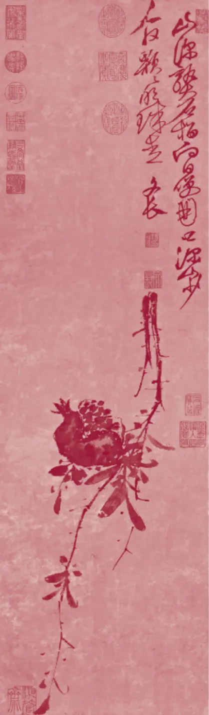 严善錞的石榴并非一种复述,而是对石榴这一图像母题的激活,使其转化为被自我经验重新感知的精神图像。严善錞的石榴在2012年就已提笔,断断续续十几年才形成完整且满意的作品,对于石榴的起心动念是因徐渭的《榴实图》①,蕴藏在笔墨间的文人风骨与气质在严善錞的思绪里埋下了石榴的种子,于是他开始了石榴的习作,如玩味一般,此刻严善錞的心里有了石榴的意;再次遇见是在丢勒的《马克西米利安一世肖像》②,如何在一位皇帝的画像里寄托江山永固的理想,丢勒选择了一颗开口的石榴。严善錞原本关注画作中的技法,但石榴再次唤起了他往日的创作情绪,石榴的形在严善錞心里萌芽。最后点染石榴创作情绪的,是一部亚美尼亚电影《石榴的颜色》③,电影极具象征义的画面与非线性的叙事颠覆着传统的观影习惯,这种实验性的创作对于艺术家严善錞来说就像一个导火线,串联起了他对于石榴的热情,于是正式开始了对石榴的创作并将作品亦命名为《石榴的颜色》。