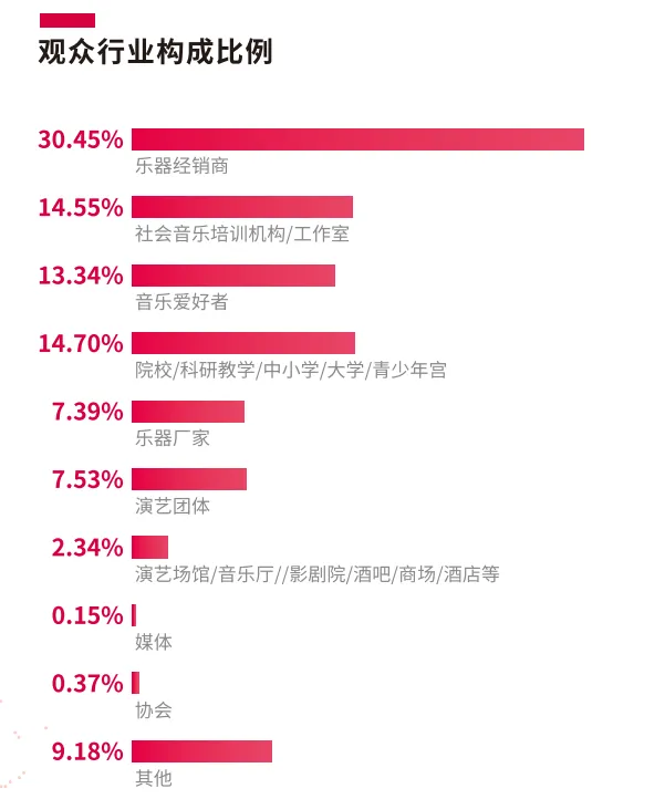 广州展致力为参展商精准对接买家资源,进一步拓宽海内外产业链接。每年,参观广州展的乐器经销商、采购商的占比超30%,社会音乐培训机构和工作室、专业院校观众占比均超过14%,音乐爱好者比例达13.34%。