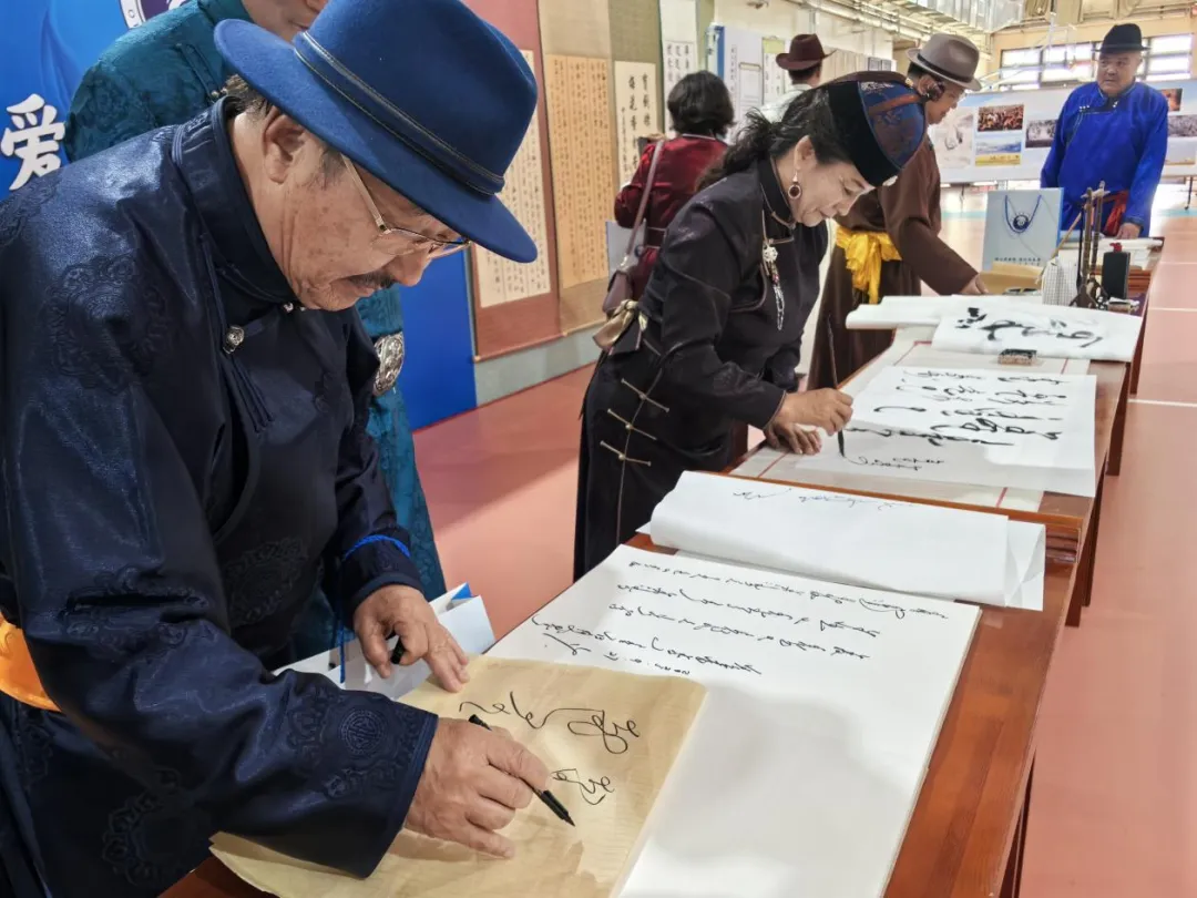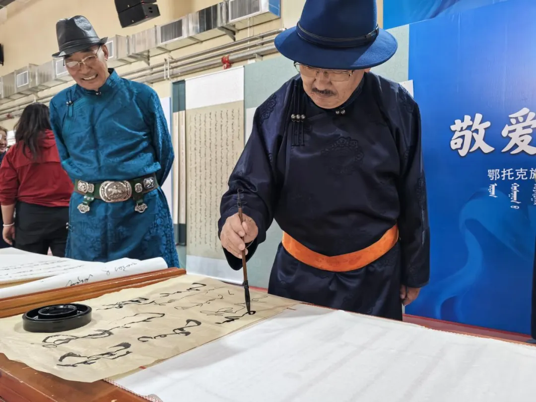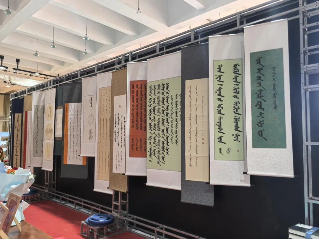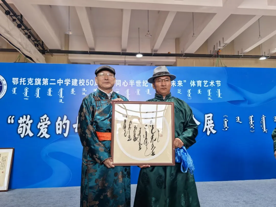 作品展区则是艺术与才华的璀璨舞台。国家级非物质文化遗产蒙古文书法代表性传承人包金山作为鄂托克旗第二中学的杰出校友,携带其精心创作的50余幅书法作品亮相会展。这些作品或苍劲有力,或温婉细腻,不仅展现了书法的独特韵味,更寄托了对母校的深情厚谊。书法爱好者们纷纷围拢,不仅欣赏了艺术之美,更以笔墨传情,写下对母校的美好祝福。