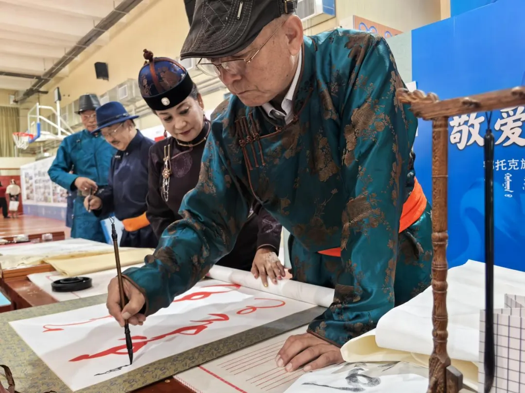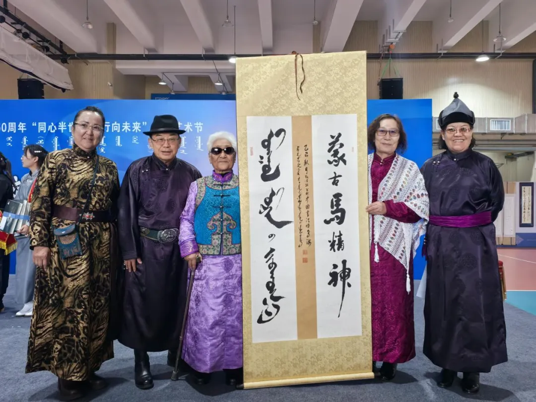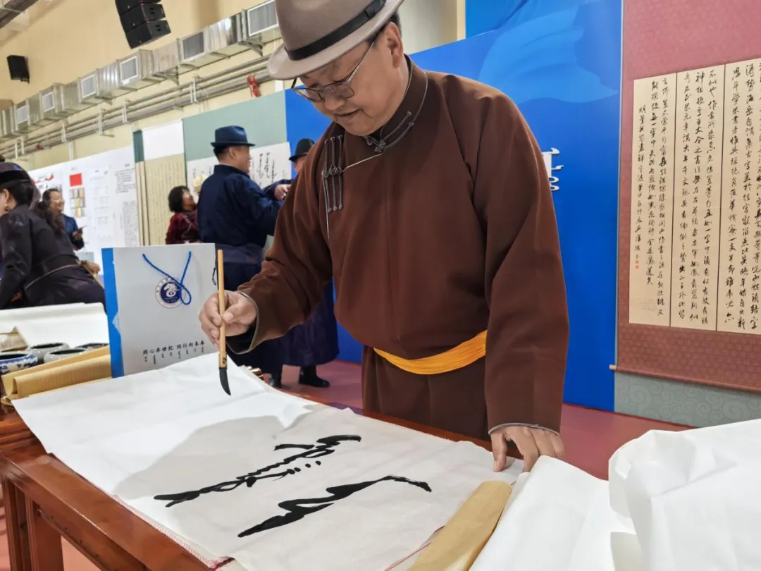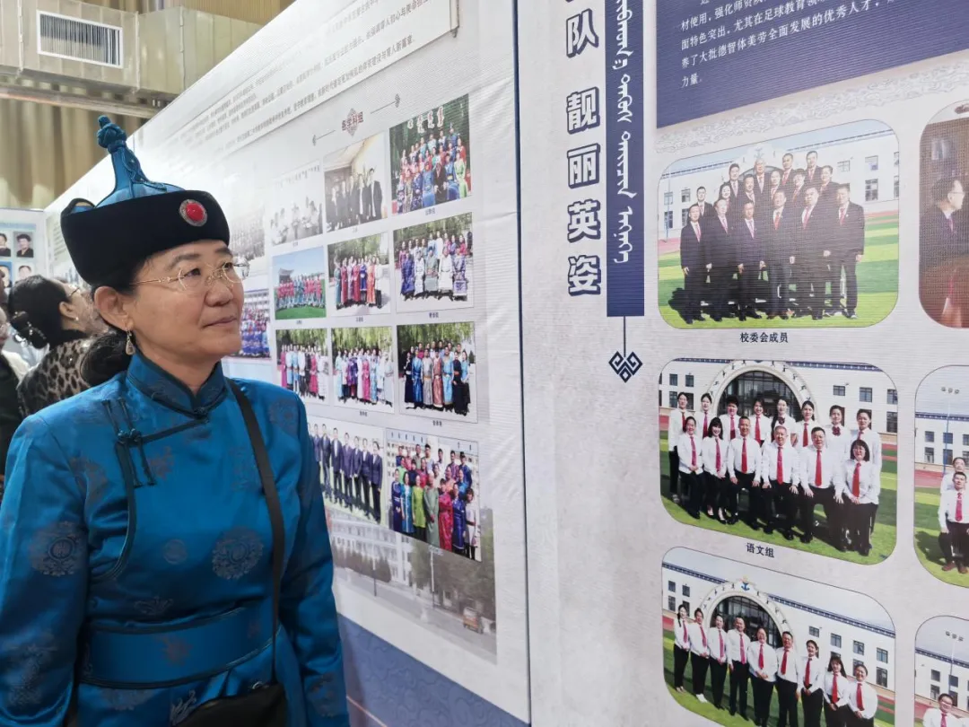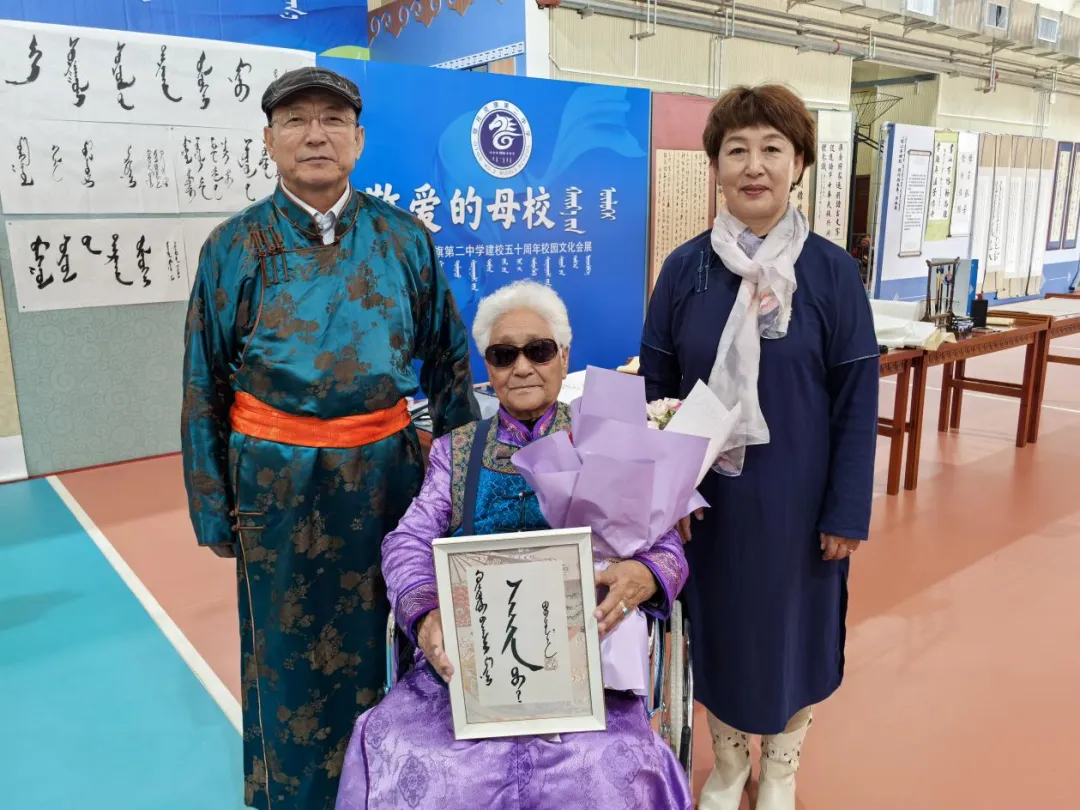 作品展区则是艺术与才华的璀璨舞台。国家级非物质文化遗产蒙古文书法代表性传承人包金山作为鄂托克旗第二中学的杰出校友,携带其精心创作的50余幅书法作品亮相会展。这些作品或苍劲有力,或温婉细腻,不仅展现了书法的独特韵味,更寄托了对母校的深情厚谊。书法爱好者们纷纷围拢,不仅欣赏了艺术之美,更以笔墨传情,写下对母校的美好祝福。
