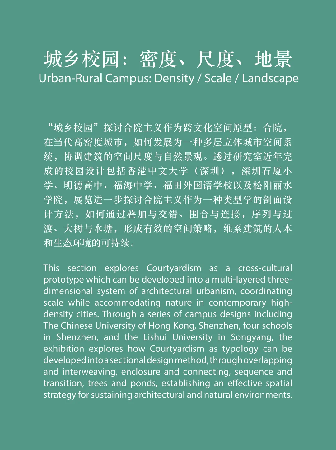 This section explores Courtyardism as a cross-cultural prototype which can be developed into a multi-layered three-dimensional system of architectural urbanism, coordinating scale while accommodating nature in contemporary high-density cities. Through a series of campus designs including The Chinese University of Hong Kong, Shenzhen, four schools in Shenzhen, and the Lishui University in Songyang, the exhibition explores how Courtyardism as typology can be developed into a sectional design method, through overlapping and interweaving, enclosure and connecting, sequence and transition, trees and ponds, establishing an effective spatial strategy for sustaining architectural and natural environments.