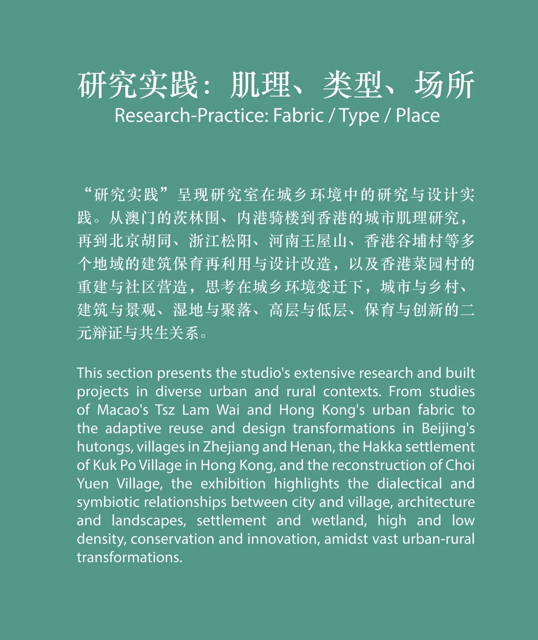 “研究实践”呈现研究室在城乡环境中的研究与设计实践。从澳门的茨林围、内港骑楼到香港的城市肌理研究,再到北京胡同、浙江松阳、河南王屋山、香港谷埔村等多个地域的建筑保育再利用与设计改造,以及香港菜园村的重建与社区营造,思考在城乡环境变迁下,城市与乡村、建筑与景观、湿地与聚落、高层与低层、保育与创新的二元辩证与共生关系。